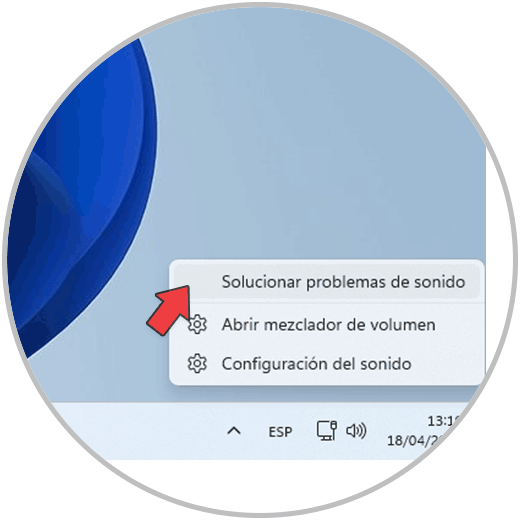 Para su uso damos clic derecho sobre el icono de volumen en la barra de tareas y allí seleccionamos "Solucionar problemas de sonido":