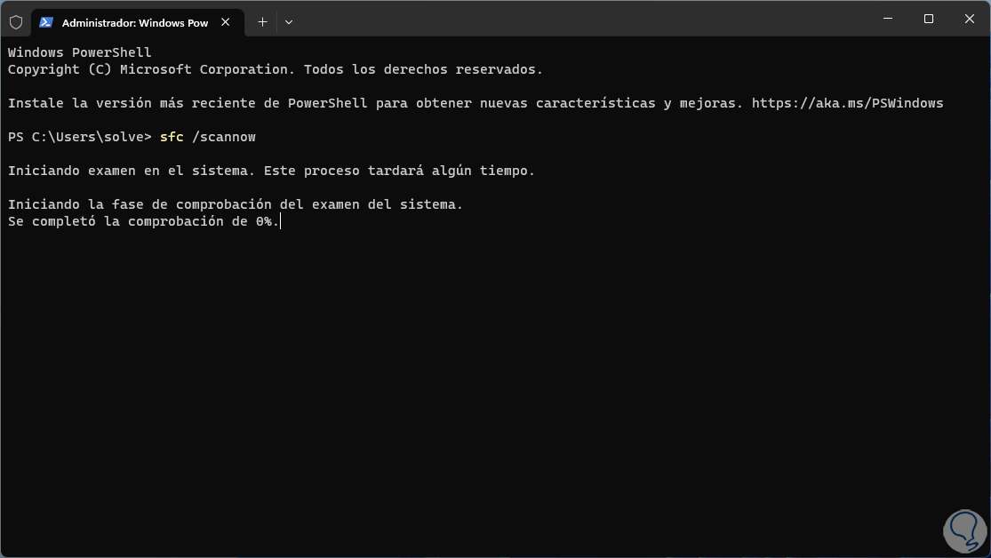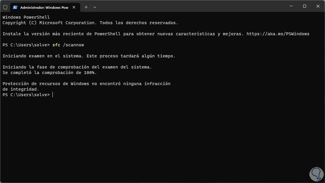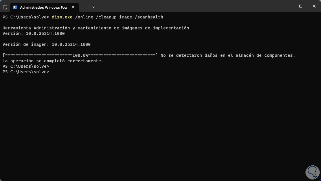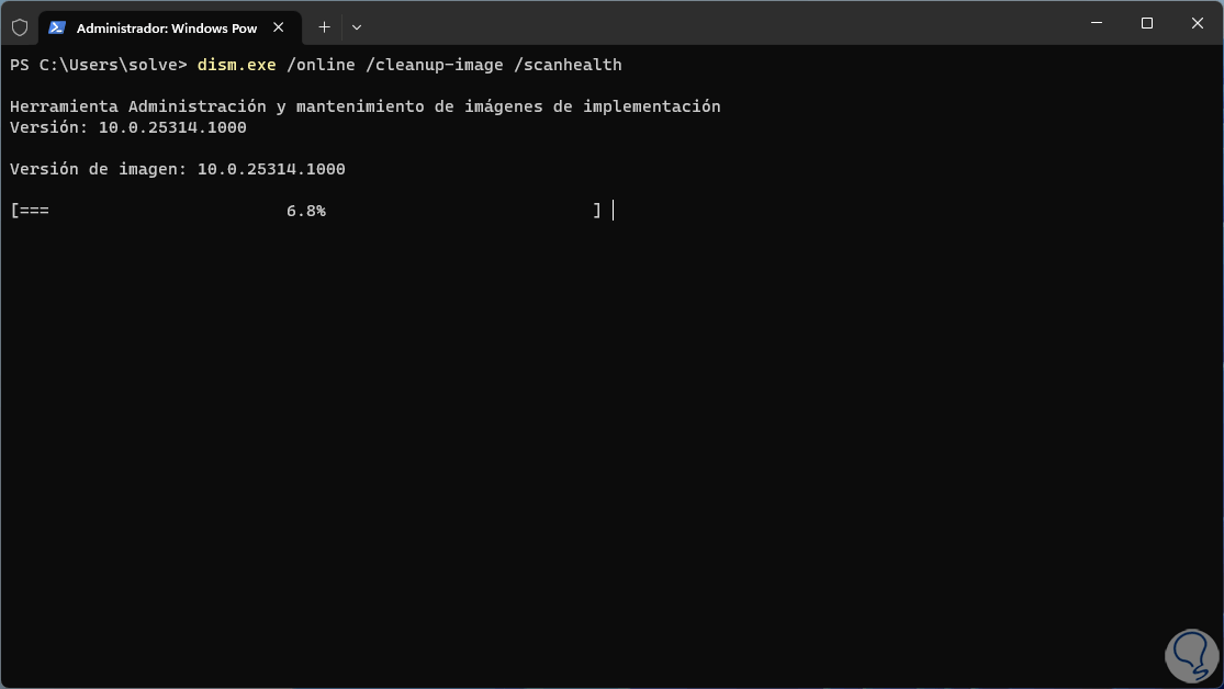 SFC (System File Checker) es un comando usado para analizar todo el sistema de archivos NTFS el cual si presentase fallas afectaría muchas partes del sistema incluyendo el audio, ahora usaremos el comando DISM para analizar la imagen local de Windows, para ello ejecutamos en primer lugar en escaneo: