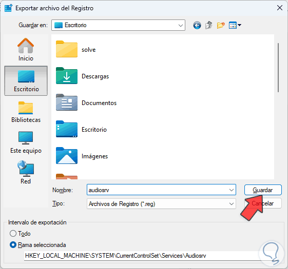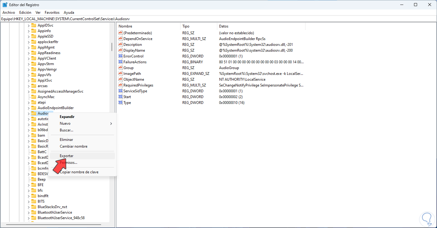 Damos clic derecho sobre la clave "Audiosrv" y seleccionamos la opción "Exportar":
