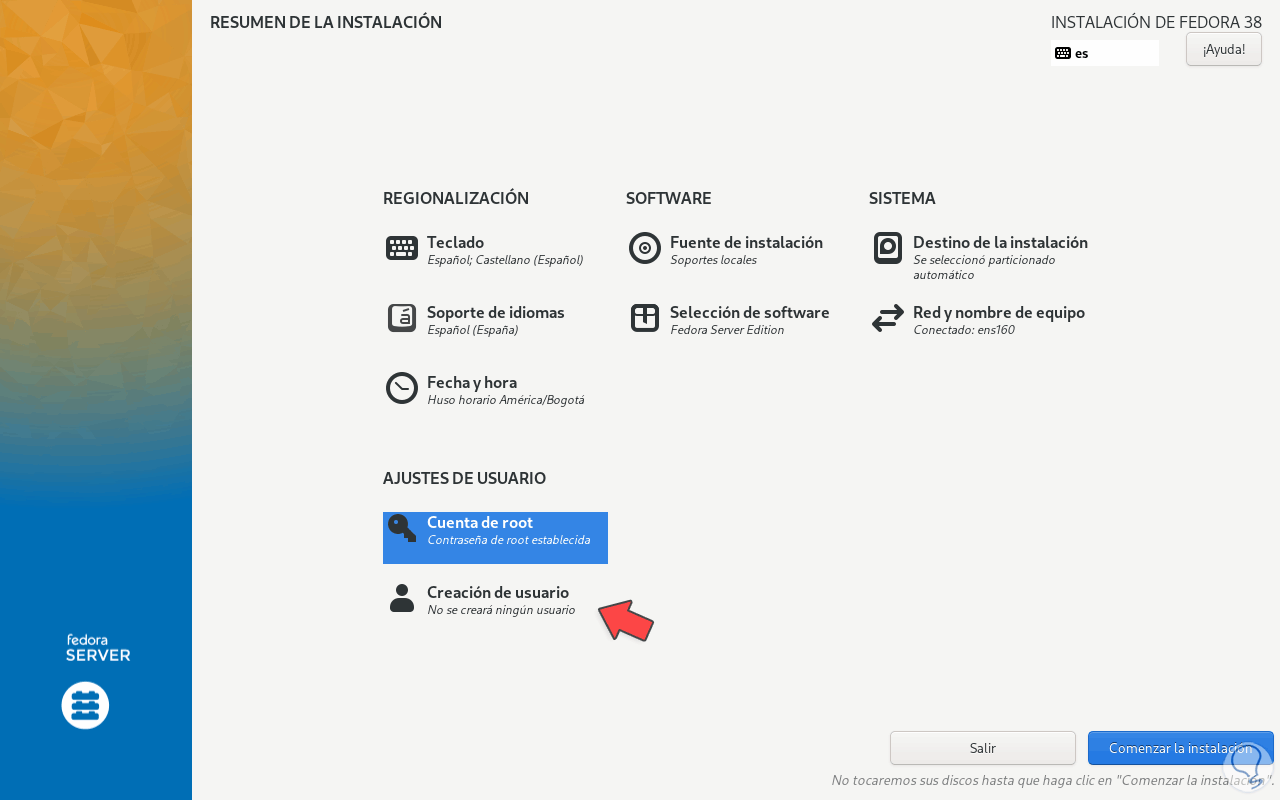 Aplica los cambios. Es posible acceder si es necesario a otras opciones de configuración: Damos clic en "Comenzar la instalación"