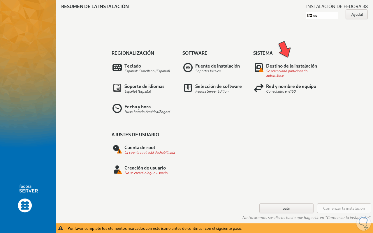 Ahora llegaremos a la ventana principal de configuración: Allí será necesario completar los campos que presentan signo de advertencia, en primer lugar damos clic en "Destino de la instalación" para ver lo siguiente: