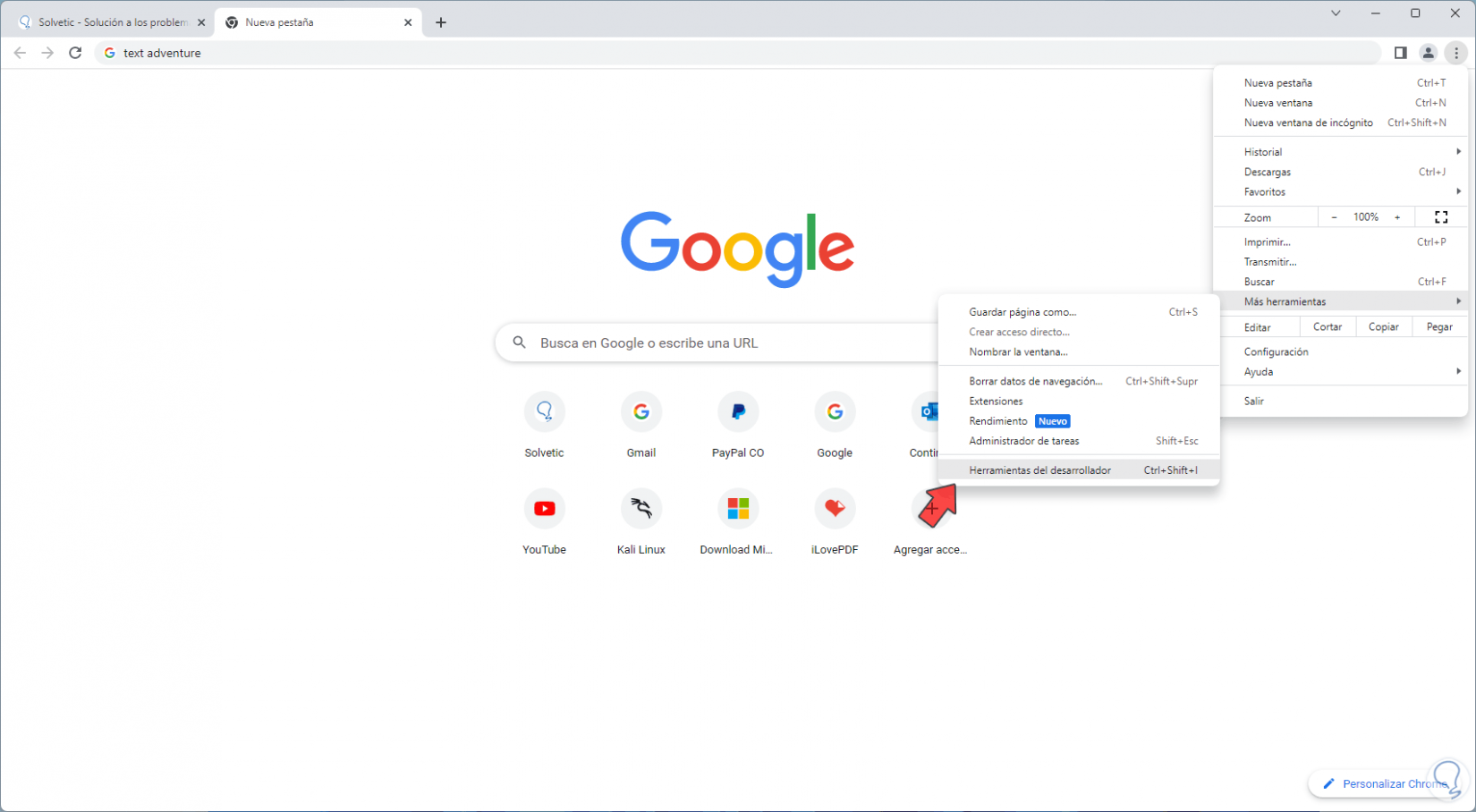 Para su uso en el buscador de Google ingresamos "text adventure" y luego iremos a "Personalizar y controlar Google Chrome - Más herramientas - Herramientas del desarrollador":