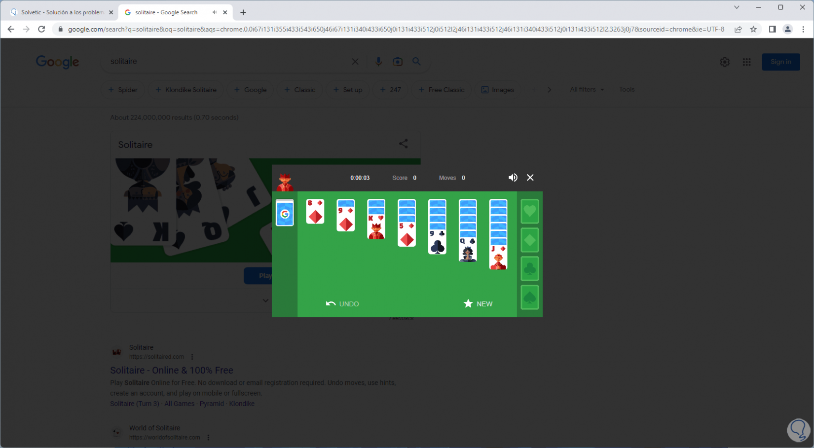 Uno de los juegos clásicos de clásicos y que hemos practicado es solitario, allí usaremos la estrategia para ordenar las cartas y ser los mejores, para su uso basta con buscar "solitaire" en Google y desde allí ejecutarlo: