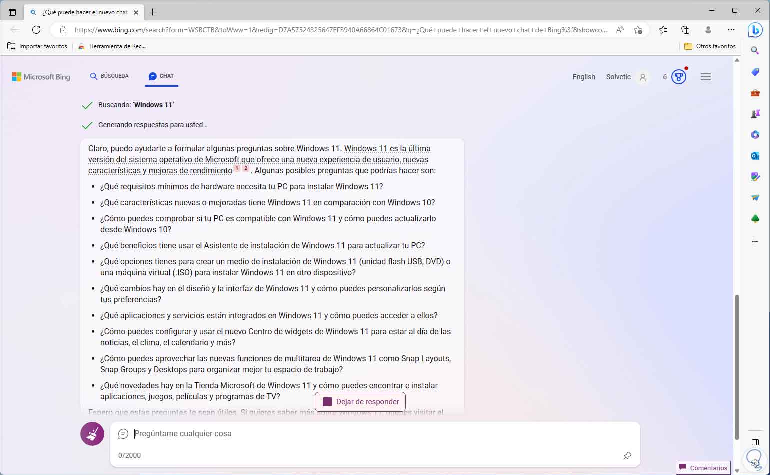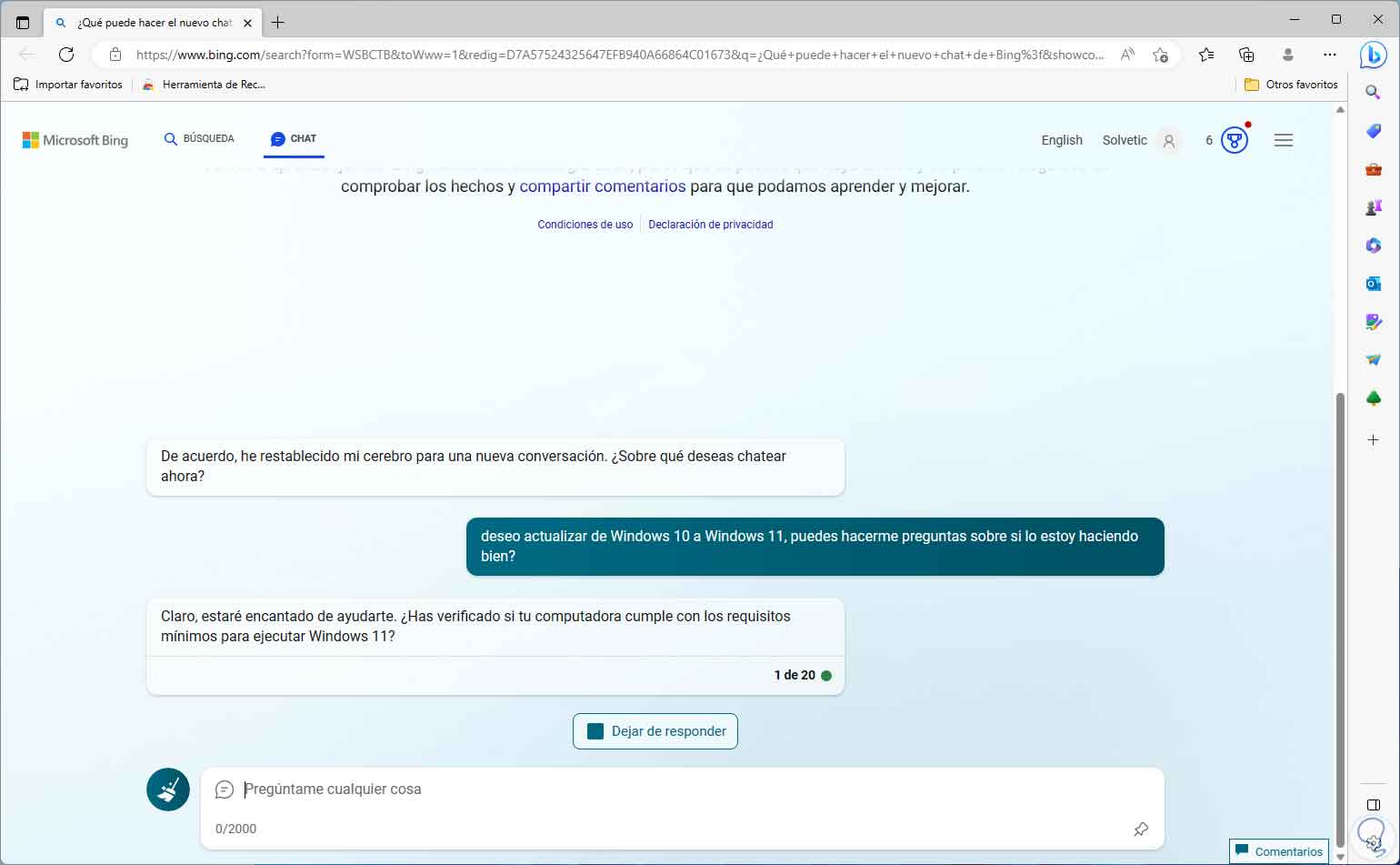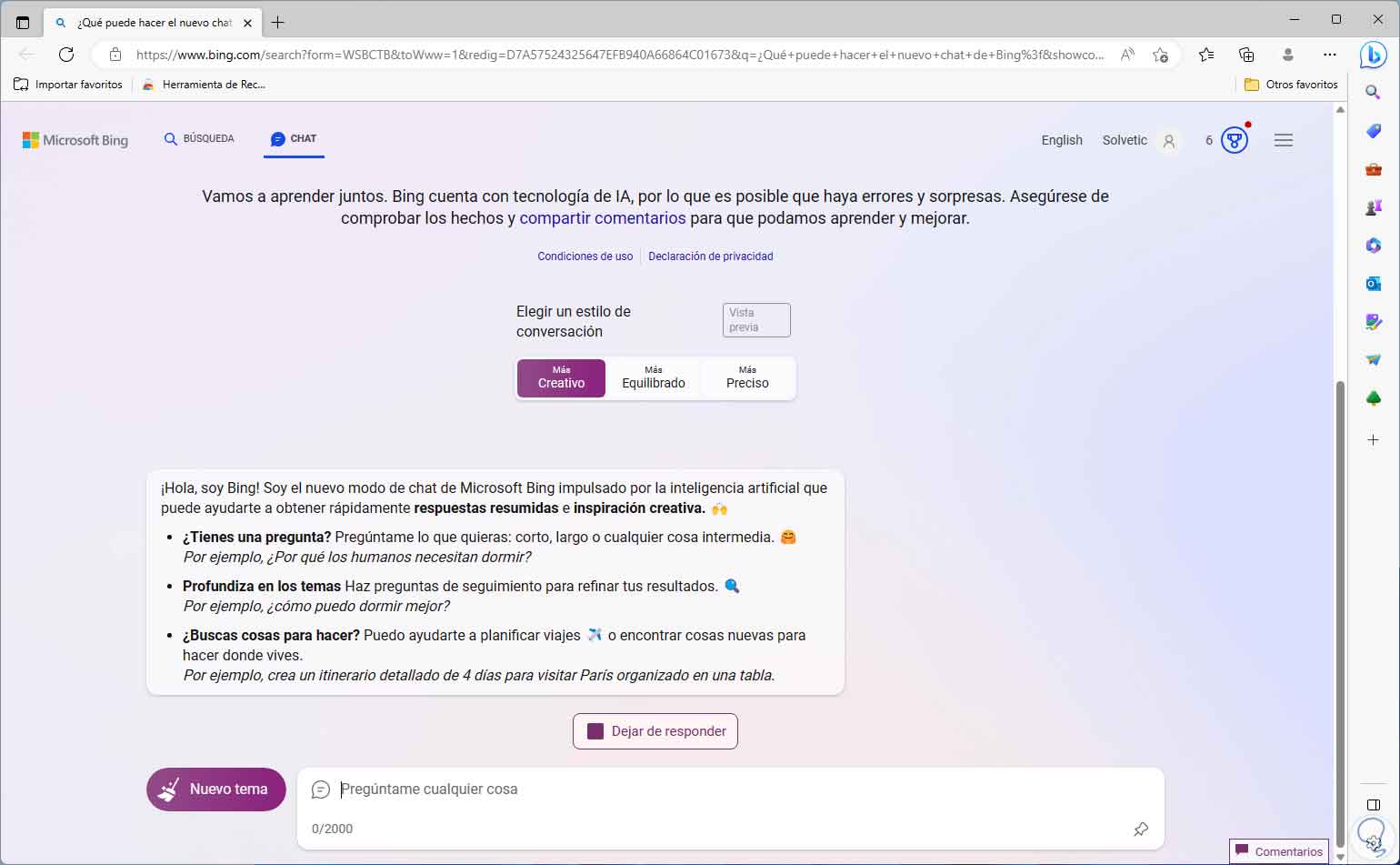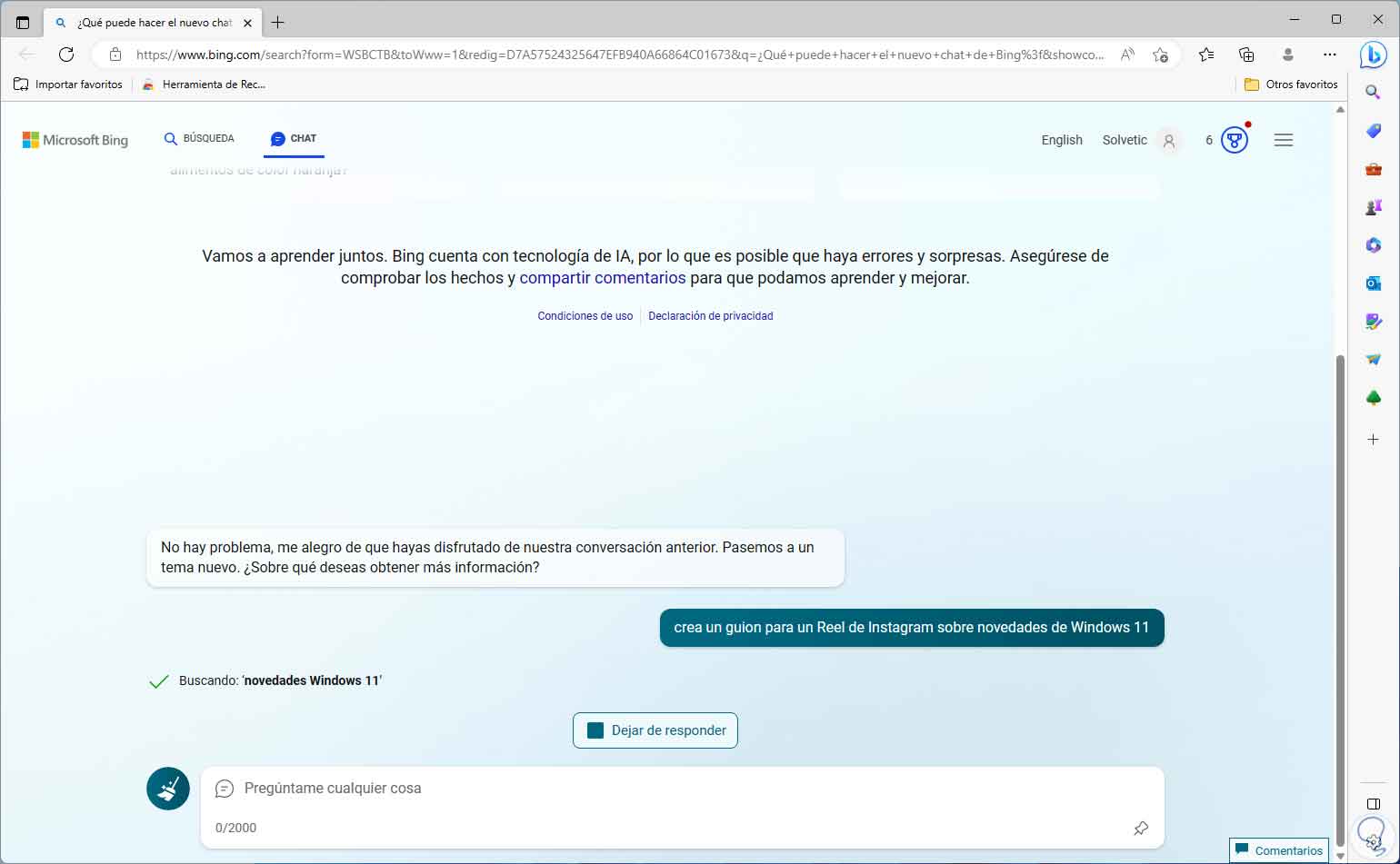 Todo esto se logra gracias a que Bing recurre a todas las fuentes en la web para los resultados, esto se hace a través de servidores potentes y mecanismos de lógica para tener la respuesta adecuada y literalmente establecer una charla con el chat. Solvetic enseñará diversas formas cómo Bing Chat ayudará de ahora en adelante a las nuevas tareas que realicemos en Windows.