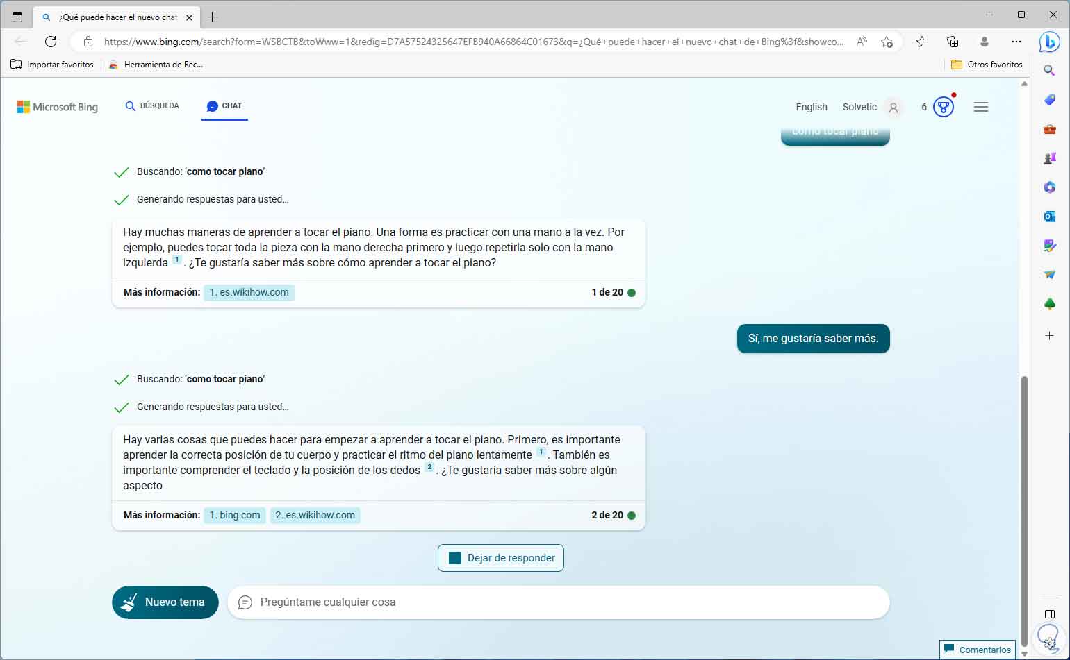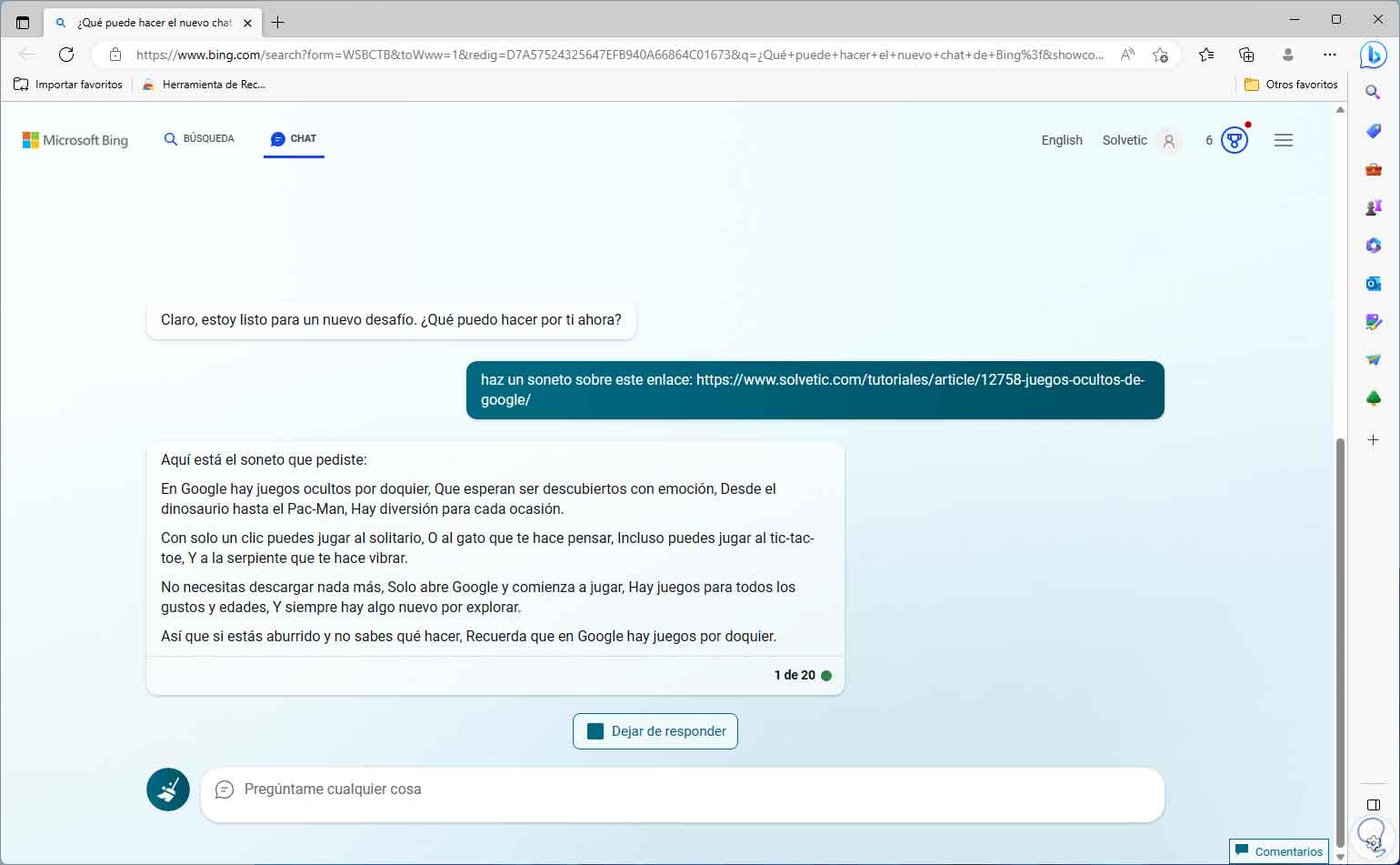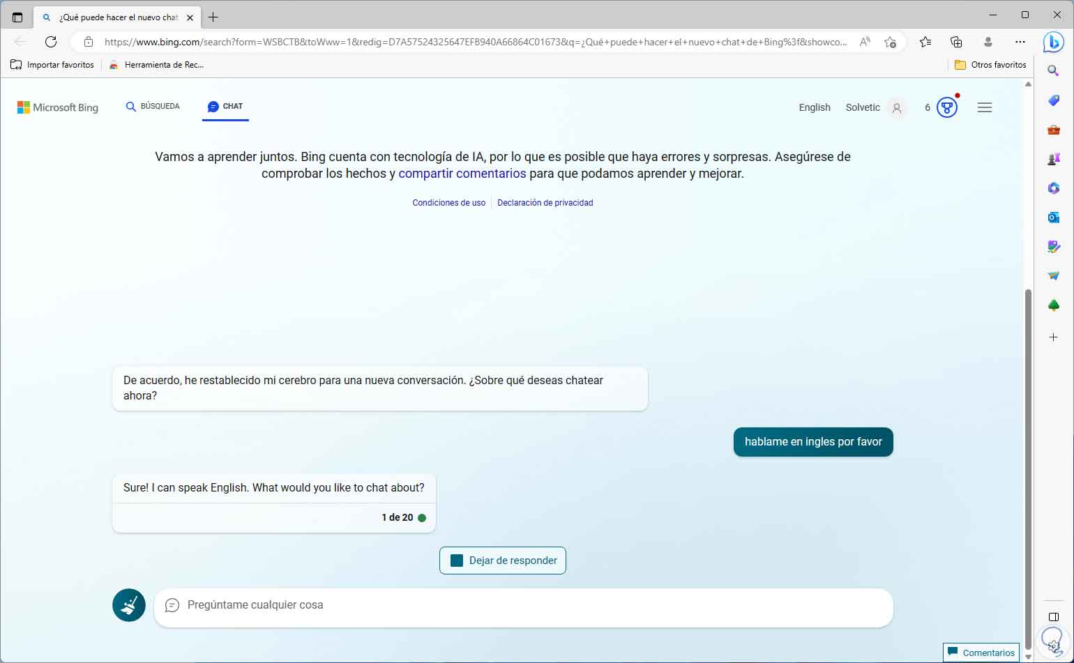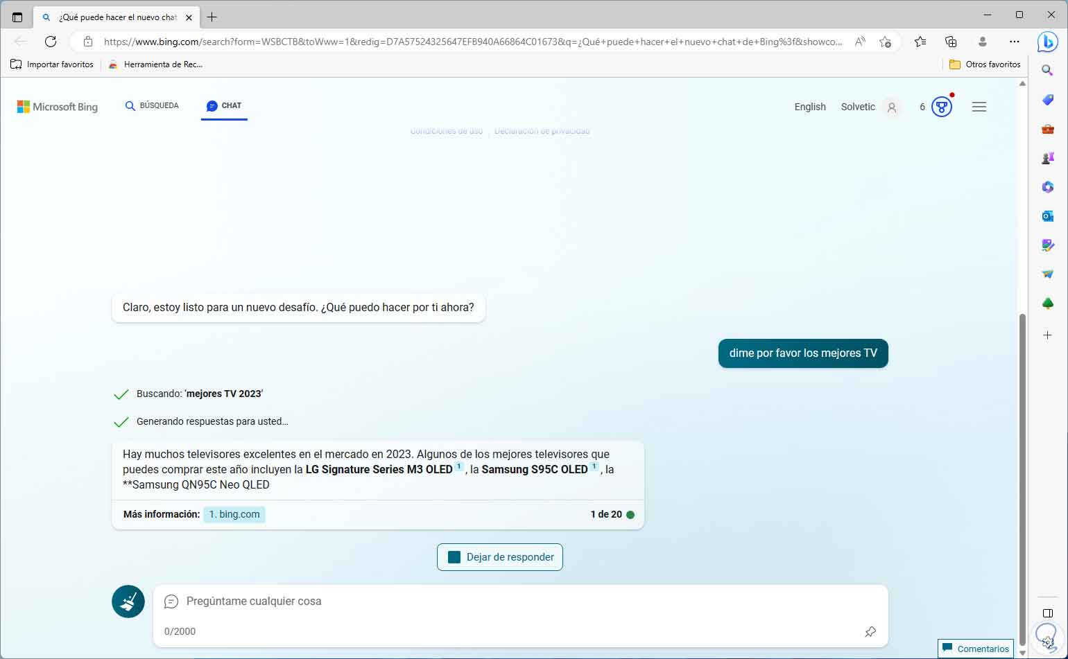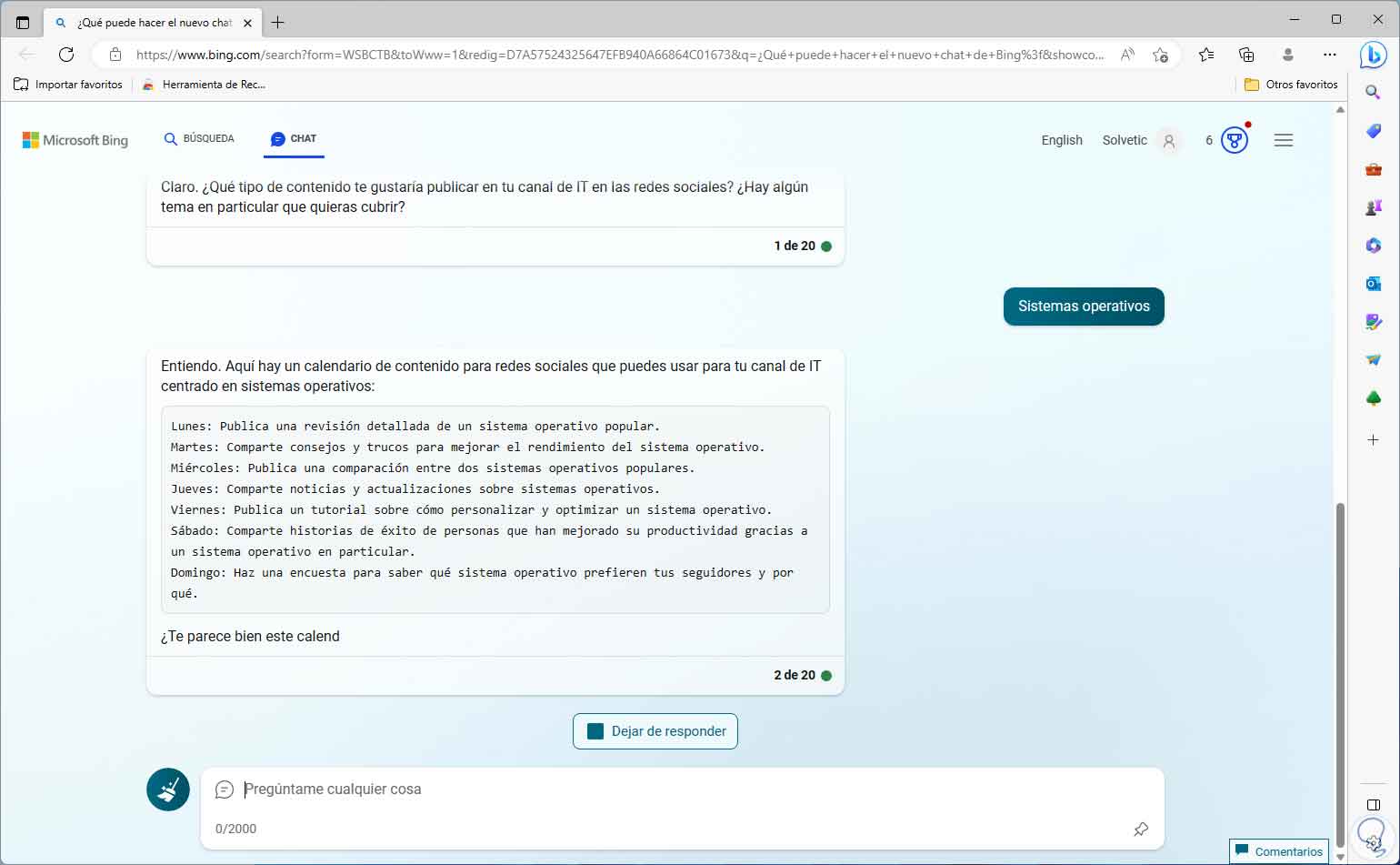 Todo esto se logra gracias a que Bing recurre a todas las fuentes en la web para los resultados, esto se hace a través de servidores potentes y mecanismos de lógica para tener la respuesta adecuada y literalmente establecer una charla con el chat. Solvetic enseñará diversas formas cómo Bing Chat ayudará de ahora en adelante a las nuevas tareas que realicemos en Windows.