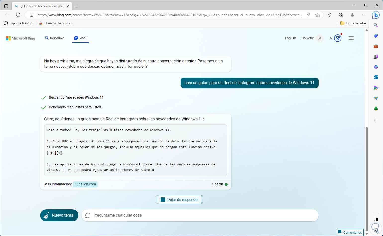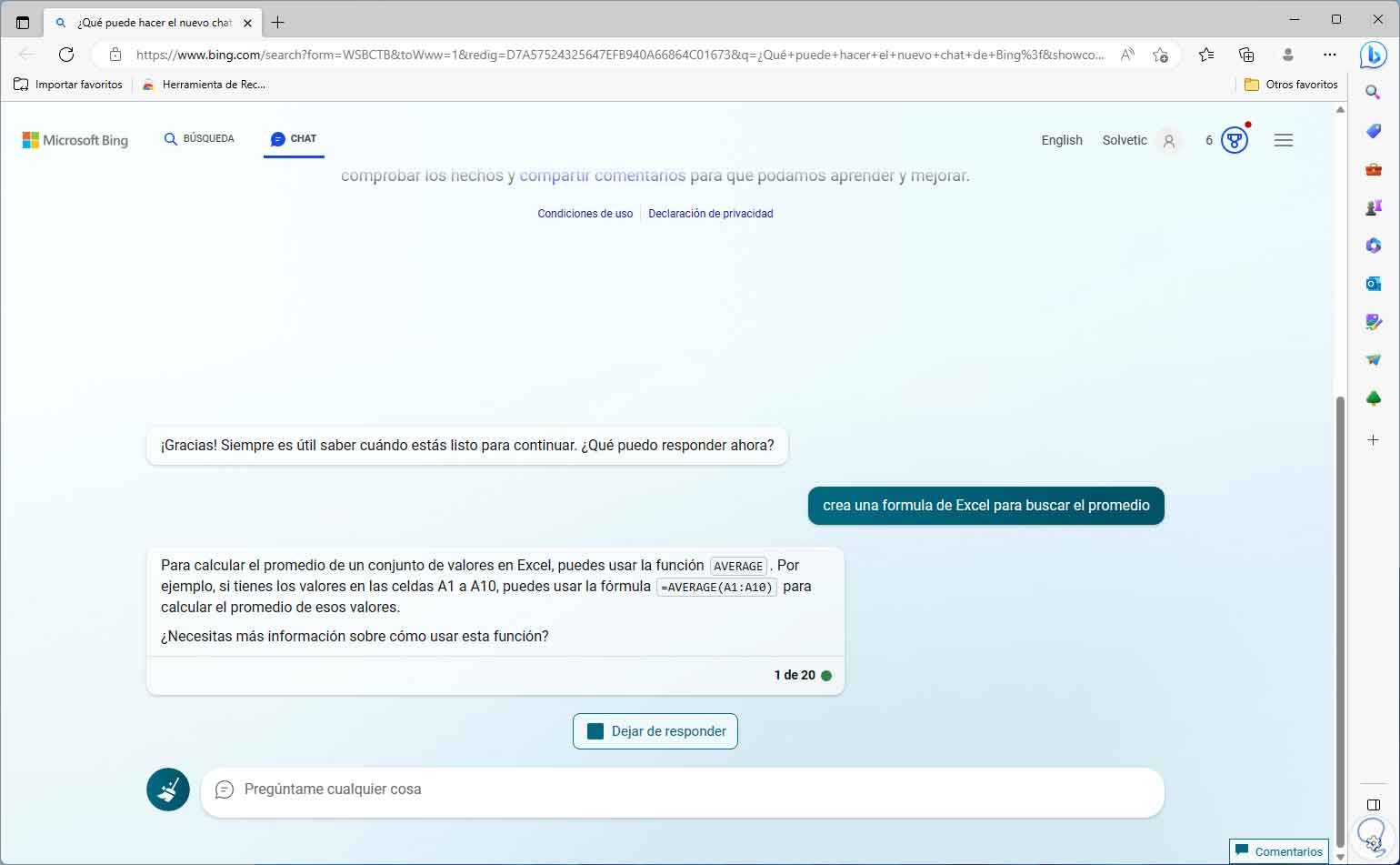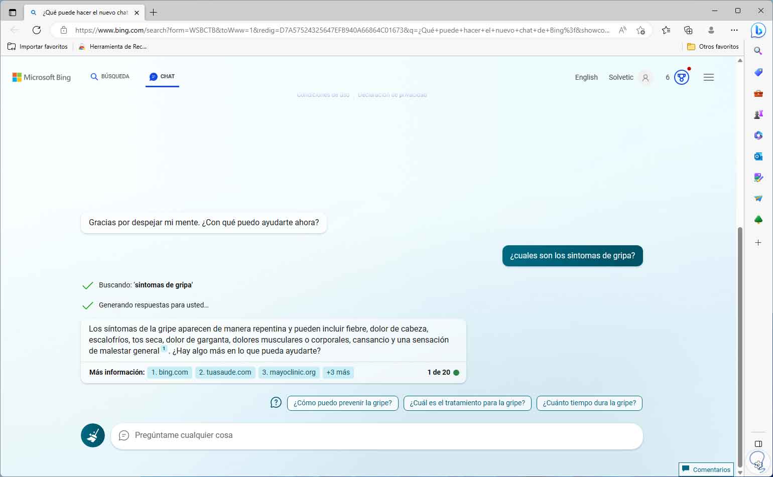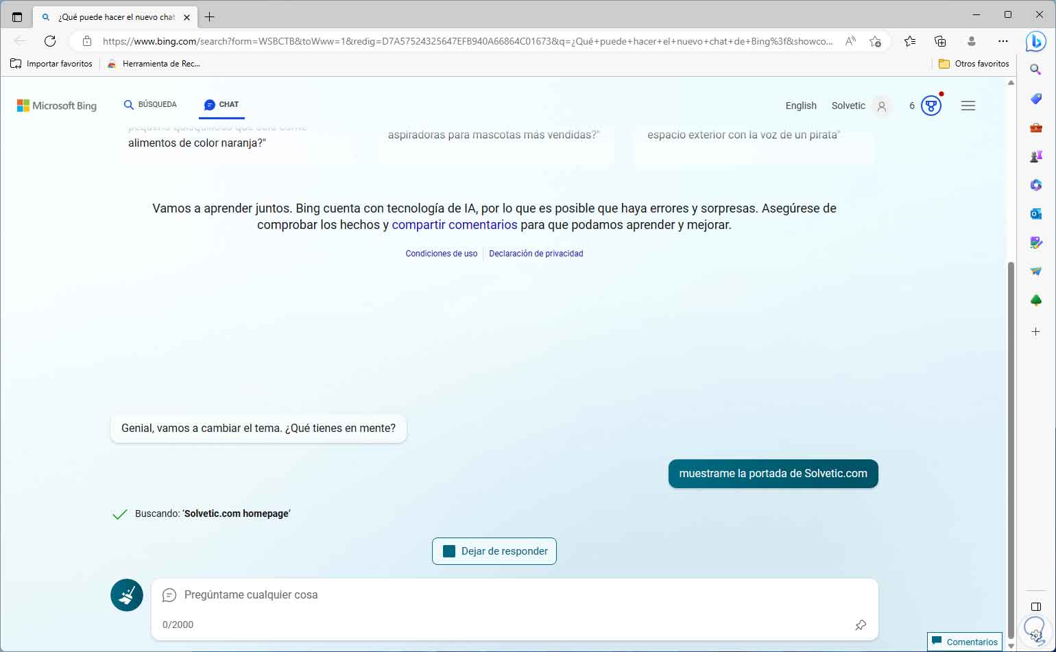 Todo esto se logra gracias a que Bing recurre a todas las fuentes en la web para los resultados, esto se hace a través de servidores potentes y mecanismos de lógica para tener la respuesta adecuada y literalmente establecer una charla con el chat. Solvetic enseñará diversas formas cómo Bing Chat ayudará de ahora en adelante a las nuevas tareas que realicemos en Windows.