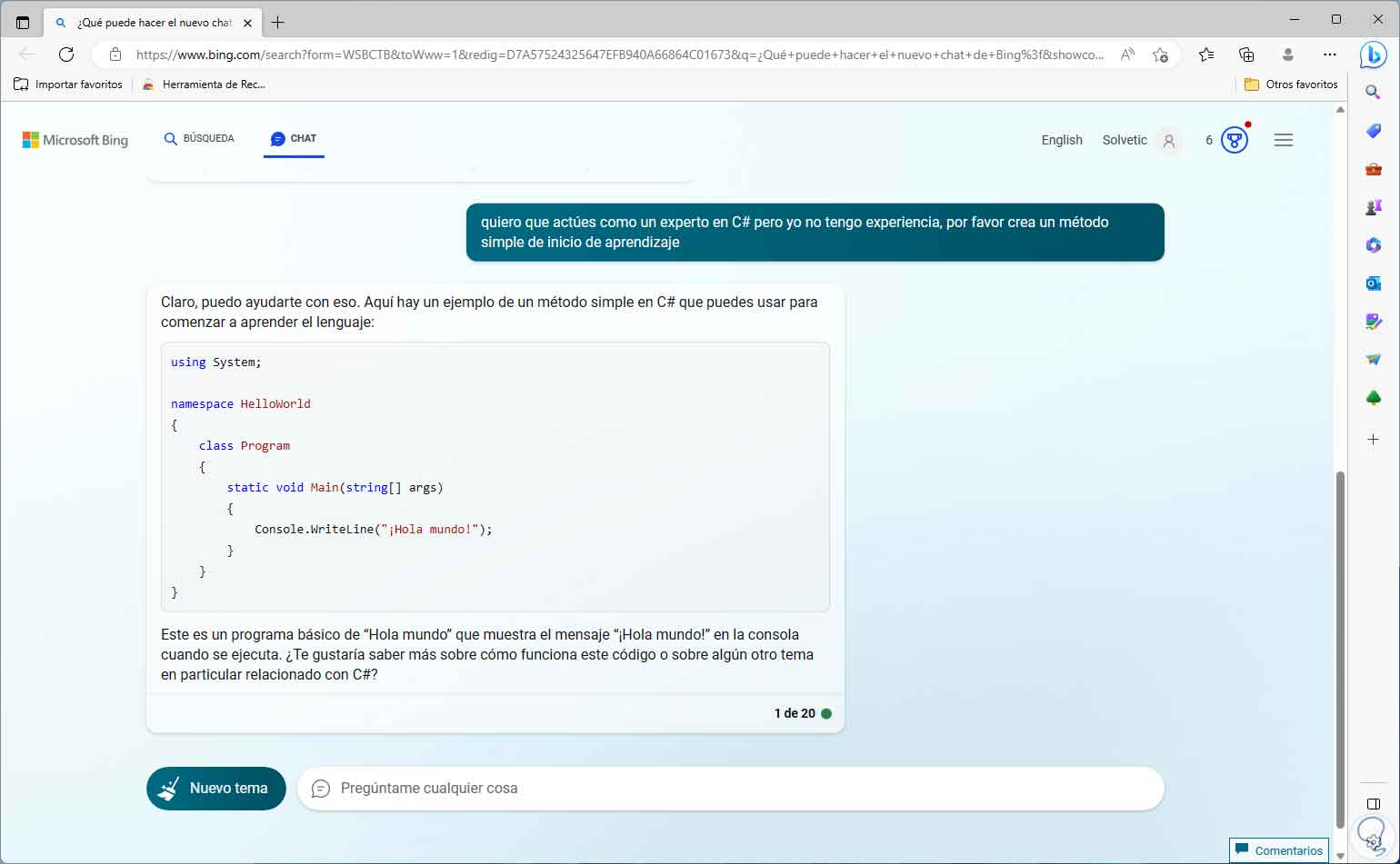 Podemos copiarlo e insertarlo en el proyecto para ver que todo está correcto. Será posible indicarle a Bing Chat que "hable" en otro idioma: