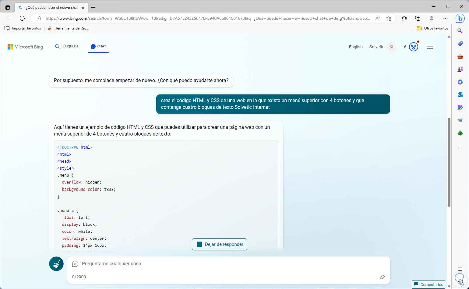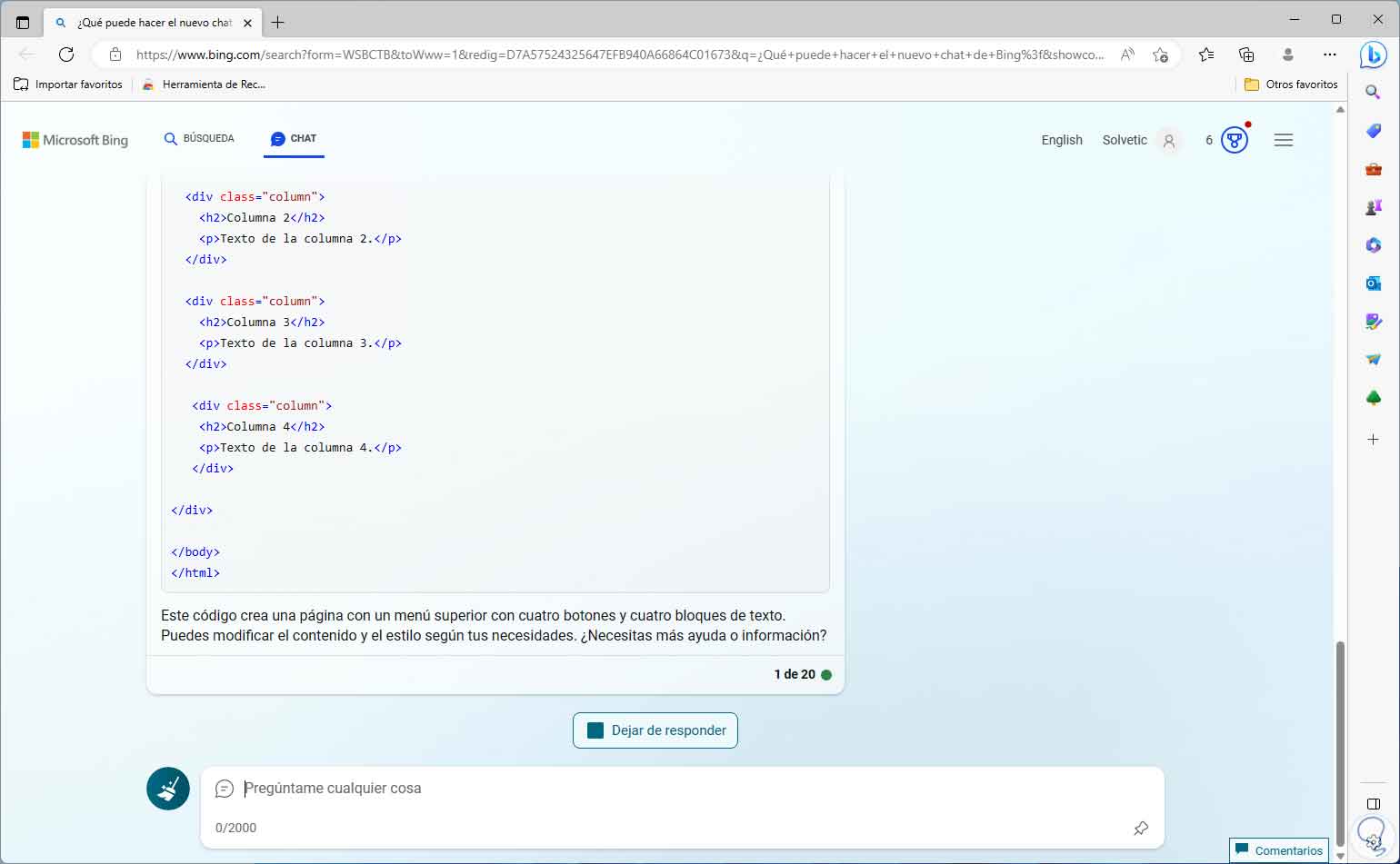 Una opción más que esencial para los desarrolladores es la oportunidad de crear sitios web con Bing Chat, esto ahorrará mucho tiempo y dolores de cabeza, por ejemplo, crearemos el siguiente código: