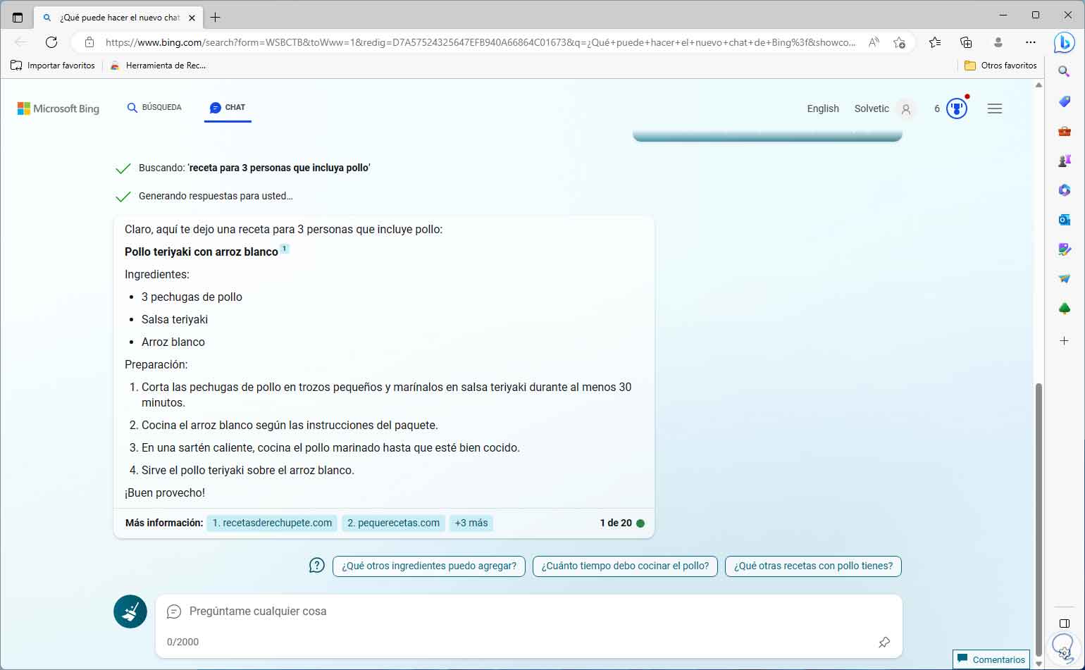 Para aquellos amantes de la cocina Bing Chat se convierte en el chef ideal, podemos buscar recetas con detalles claves: