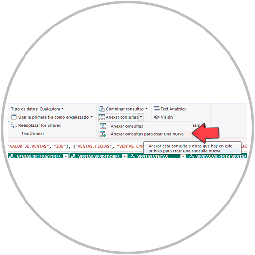 Sin embargo, si el tipo de fusión de tablas que queremos realizar es el de pegar datos unos debajo de otros para poder construir una única tabla, entonces debemos usar la función de anexar consultas”, que como veremos en la imagen abajo se encuentra justo debajo de la opción de “combinar consultas”.