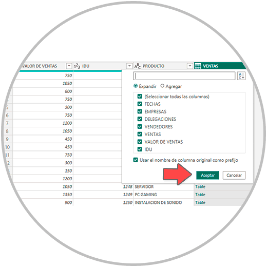 A continuación, lo que vamos a realizar es desplegar las columnas que queramos, ya que como hemos dicho queremos ver todas las columnas de las dos hojas que importamos del archivo Excel. Para realizar este paso, tenemos que hacer clic en el icono que aparece a la derecha, en la última columna. Al dar clic veremos como se despliega un pequeño menú donde podemos elegir que columnas queremos añadir de la segunda tabla.