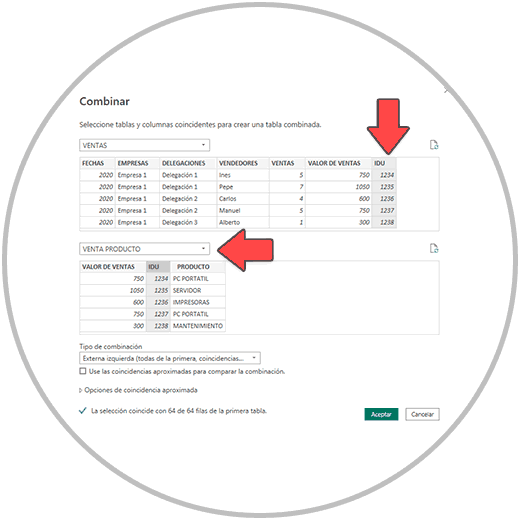 Se abre una ventana nueva donde debemos elegir que datos (consultas) queremos combinar en Power BI. Desde esta nueva ventana, debemos seleccionar en los desplegables las dos consultas a combinar, en este caso siguiendo el ejemplo elegimos las consultas “VENTAS” y “VENTA PRODUCTO”.
