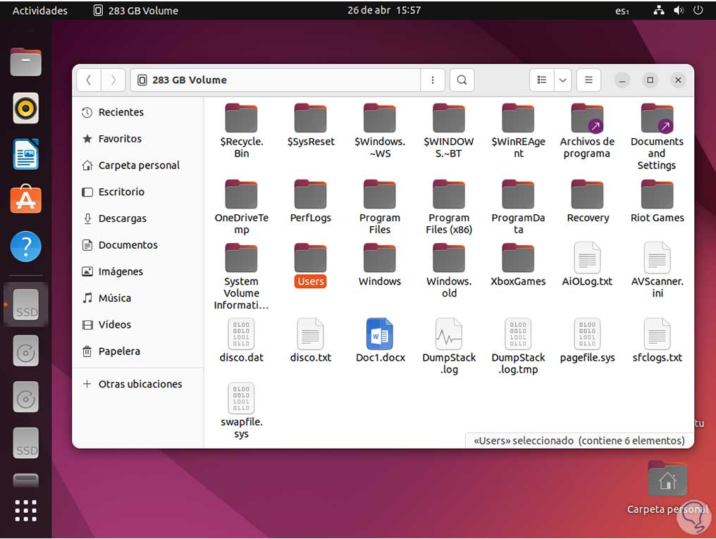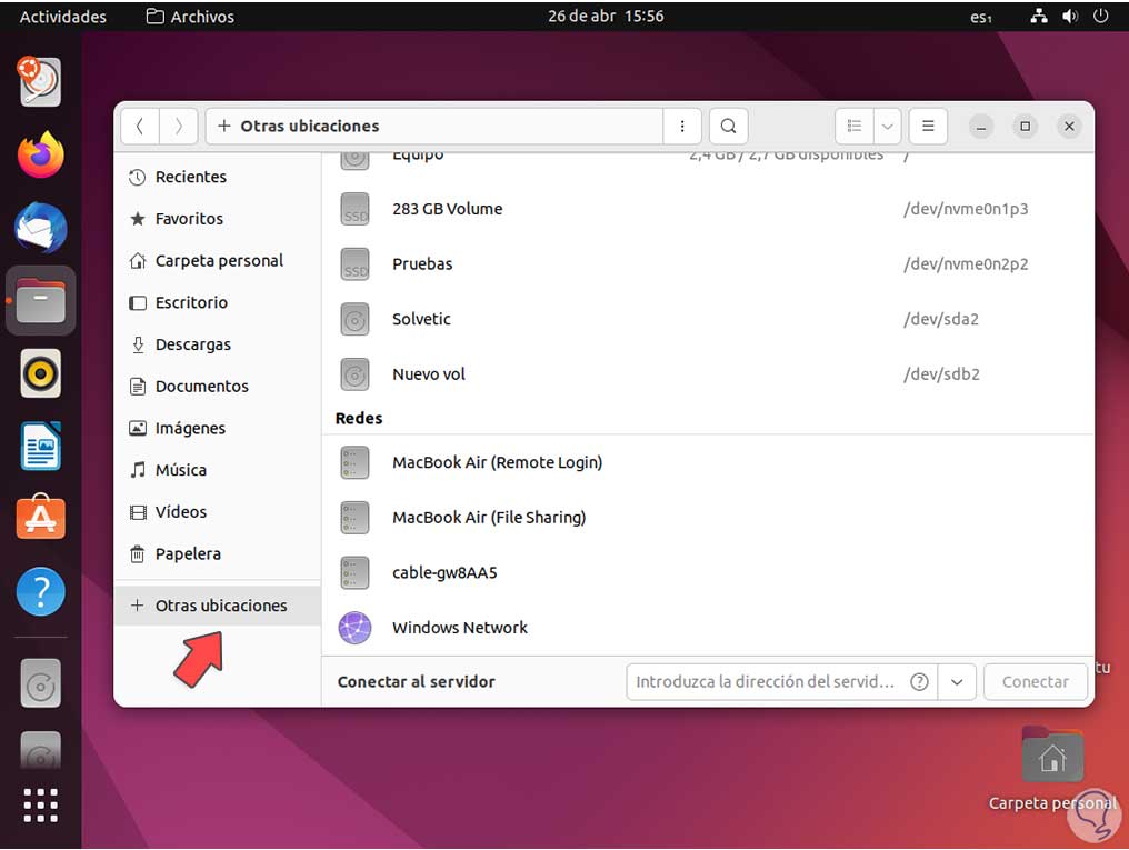 Ahora abrimos el administrador de archivos y damos clic en "Otras ubicaciones":