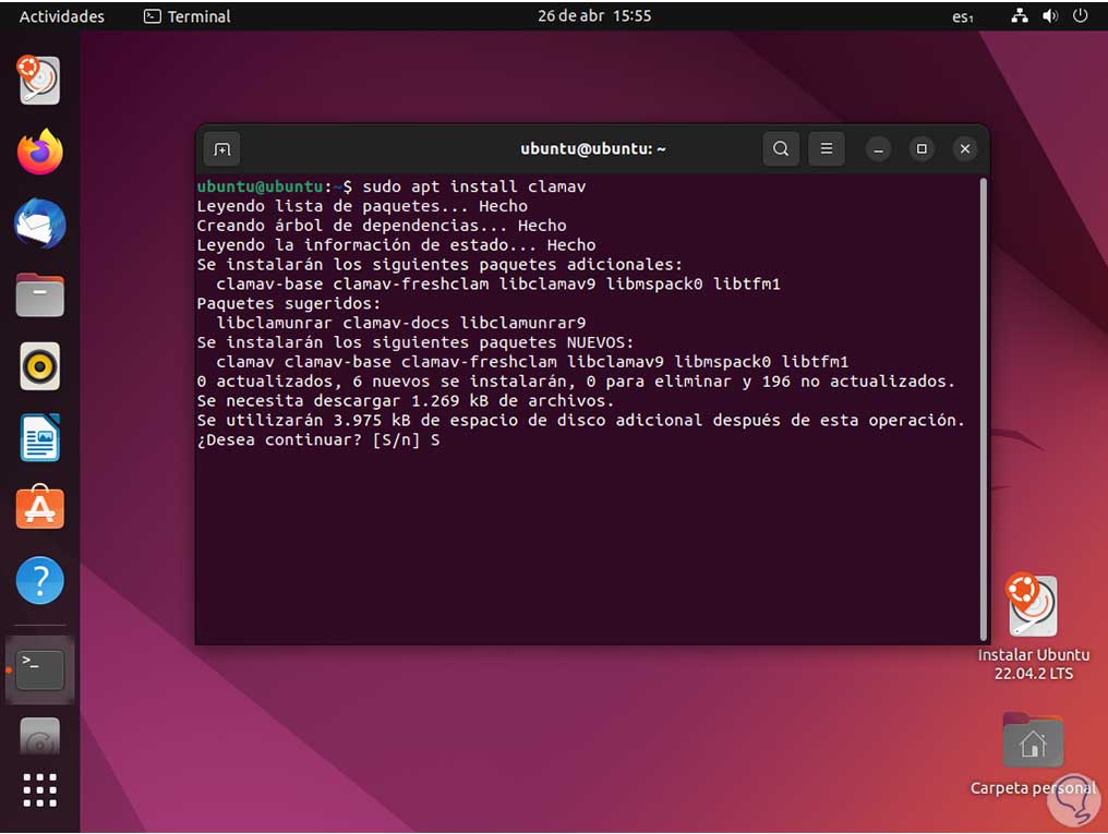 Confirmamos la operación con la letra S y esperamos que finalice el proceso: