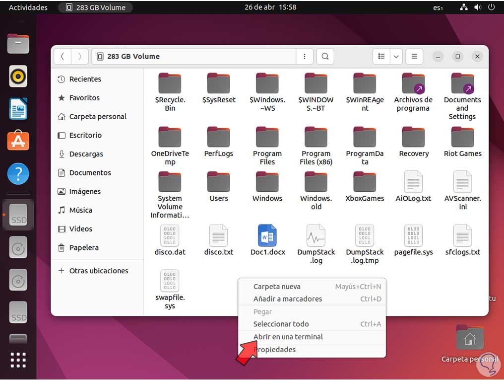 Allí damos clic derecho en algún lugar libre y seleccionamos "Abrir en una terminal":