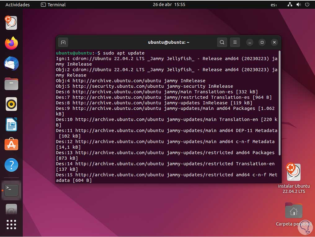 En este modo será posible explorar todas las características del sistema así como añadir usuarios y programas pero al cerrar la sesión o reiniciar el sistema todo se perderá, de allí que no afecte a Windows. Abrimos la terminal usando las teclas siguientes, actualizamos el sistema: