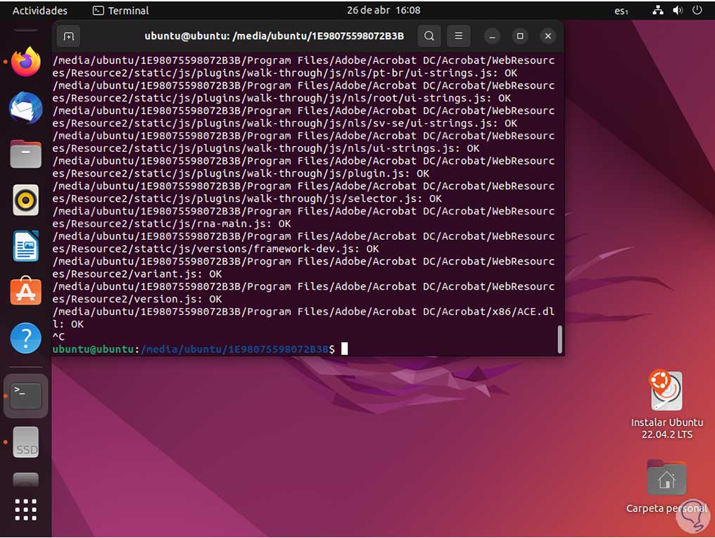 Esto abrirá la unidad en la terminal, ejecutamos el análisis con el comando: