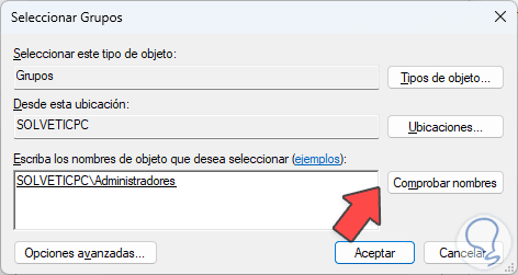 Ingresamos "Administradores" y damos clic en "Comprobar nombres":