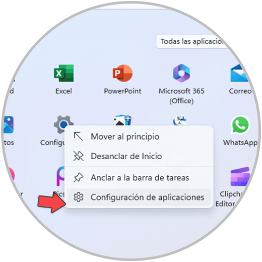 En este caso pulsamos el menú Inicio y damos clic derecho sobre Configuración para seleccionar la opción "Configuración de aplicaciones":