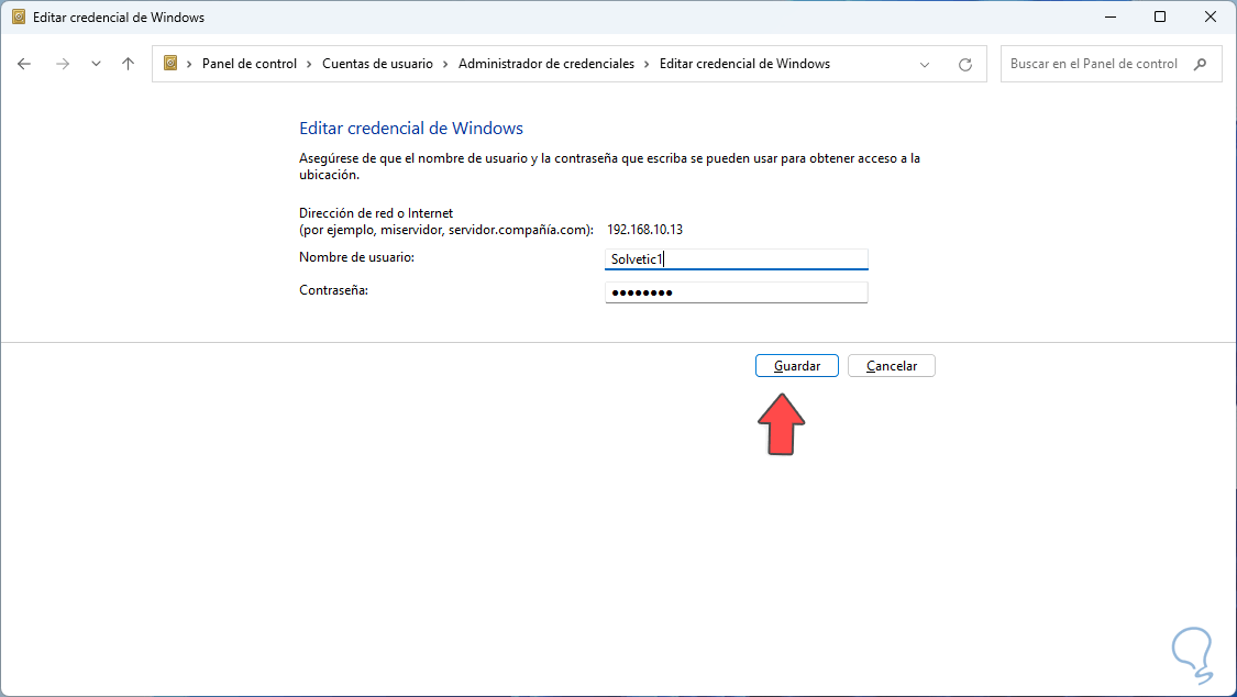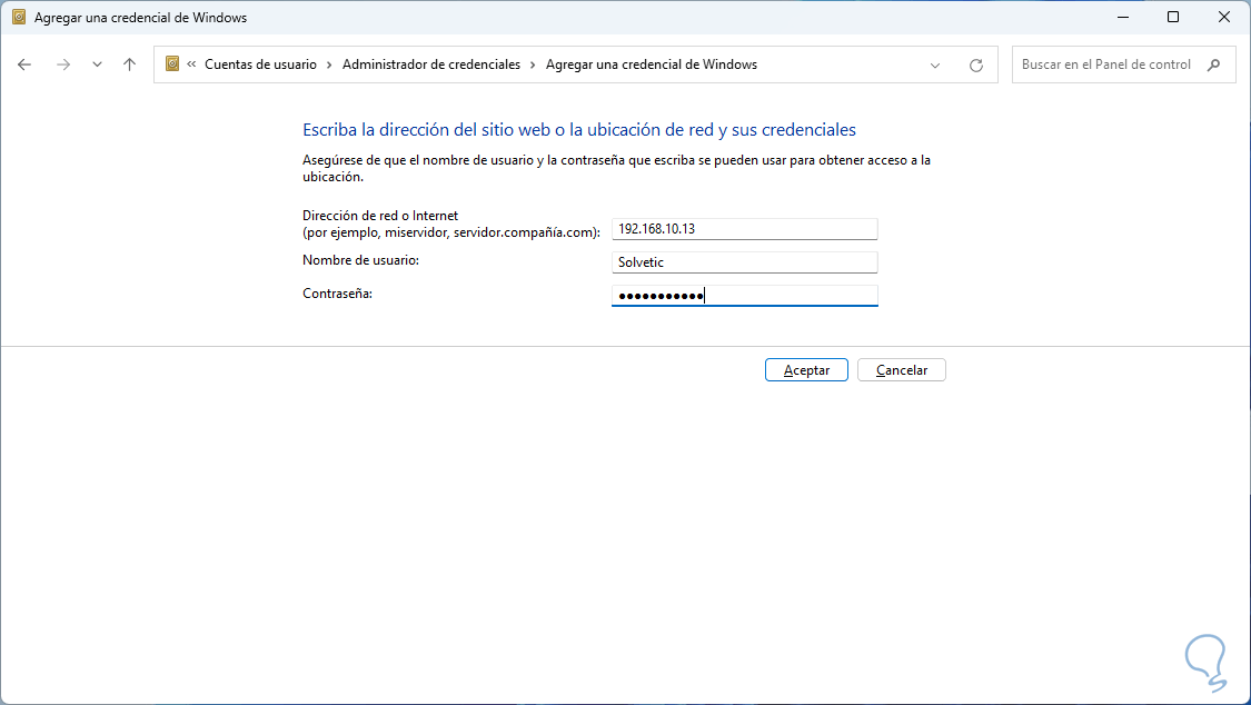 Es posible agregar de forma manual credenciales en el Administrador, damos clic en "Agregar una credencial de Windows" y luego ingresamos los datos requeridos: