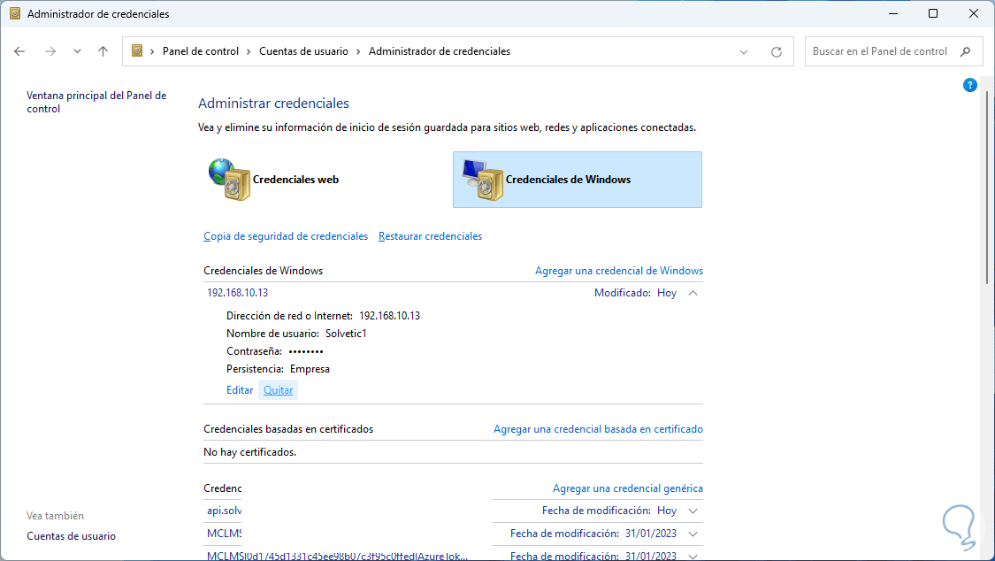 Para quitar una credencial del Administrador damos clic sobre ella: