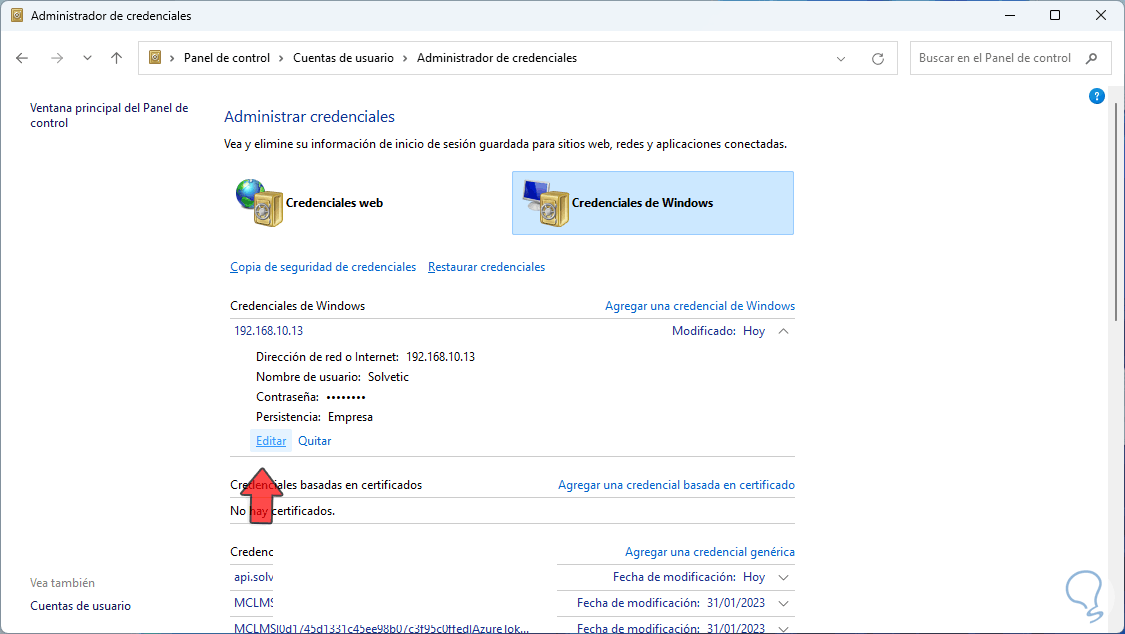 Para editar una credencial damos clic sobre ella y luego damos clic en "Editar":