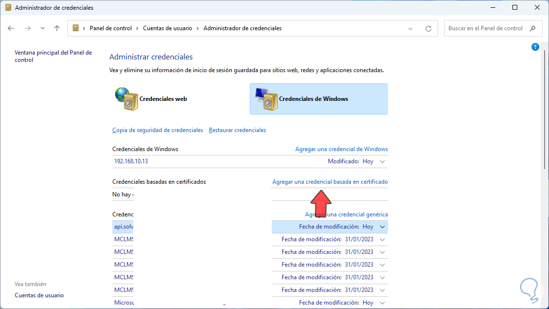 Finalmente es posible dar clic en "Agregar una credencial basada en certificado" para hacer uso de credenciales de este tipo: