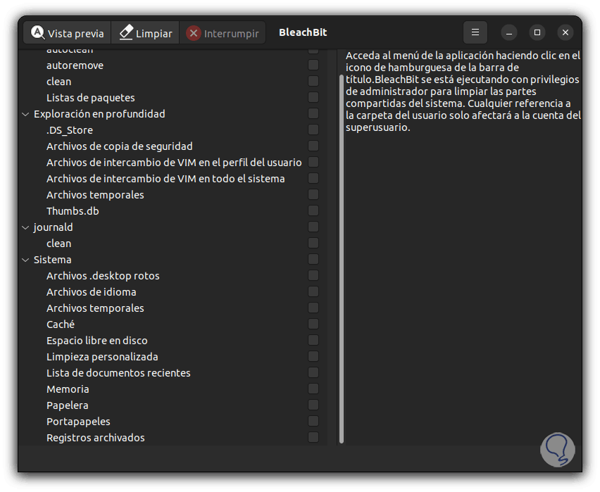 Finalmente una opción ideal y grafica de borrar de forma segura archivos en Linux es con Bleachbit, esta es una app de software libre y gratuito que nos permite tanto limpiar como liberar espacio en el disco duro y está disponible para Linux, Windows y macOS.