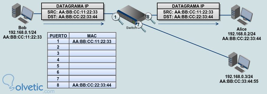 En adelante, cualquier trama que Alice envíe a Bob, será encaminada al puerto que registre en la tabla CAM la dirección MAC de Bob.