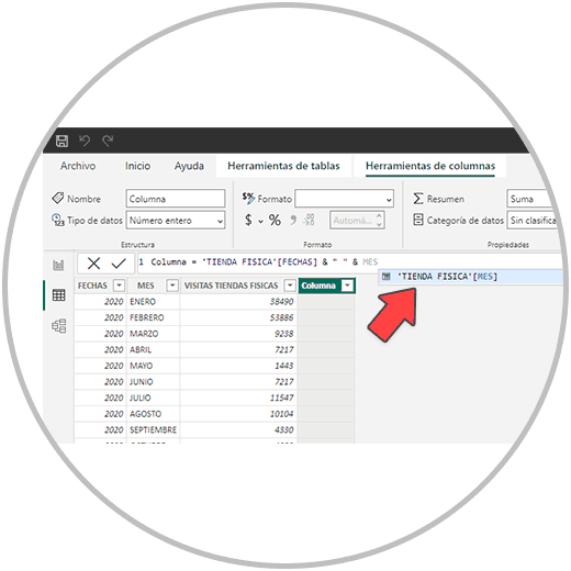 En este caso, va a ser una concatenación de columnas para construir, como ya te hemos explicado, una columna nueva que contenga un identificador único. Vamos a usar está técnica en las tablas “VISITAS WEB” y “TIENDA FÍSICA”, pero también en la tabla “MES DE VENTA”. Así podremos conectar las tablas “VISITAS WEB” y “TIENDA FÍSICA” con el modelo de datos que estamos creando.