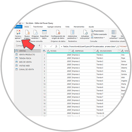 Una vez que ya hemos revisado todas las consultas en el editor de Power Query, vamos a terminar la fase de transformación de datos aplicando cambios y cerrando el editor de Power Query, opción que como vemos en la imagen abajo, se encuentra en la barra de tareas al inicio.