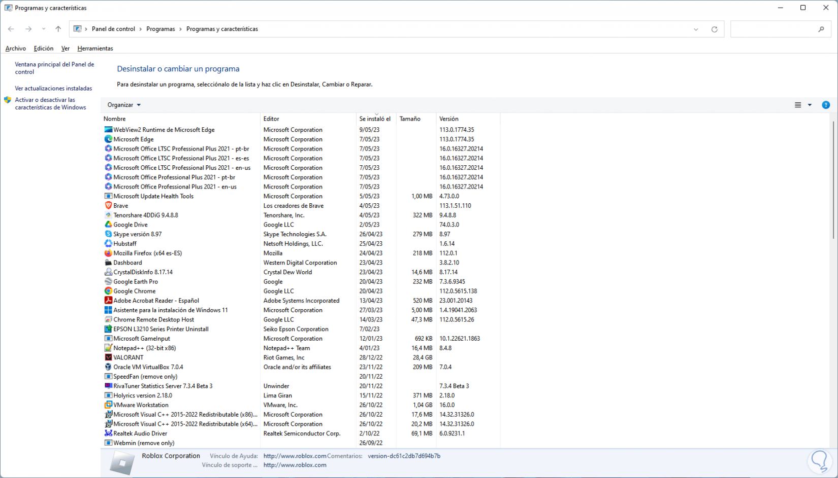 Esto nos redireccionara al Panel de control. Seleccionamos "Roblox Player for (usuario)", damos clic en "Desinstalar":