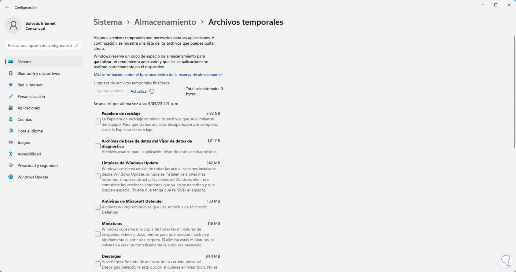 Veremos las siguientes opciones. Damos clic en "Archivos temporales":