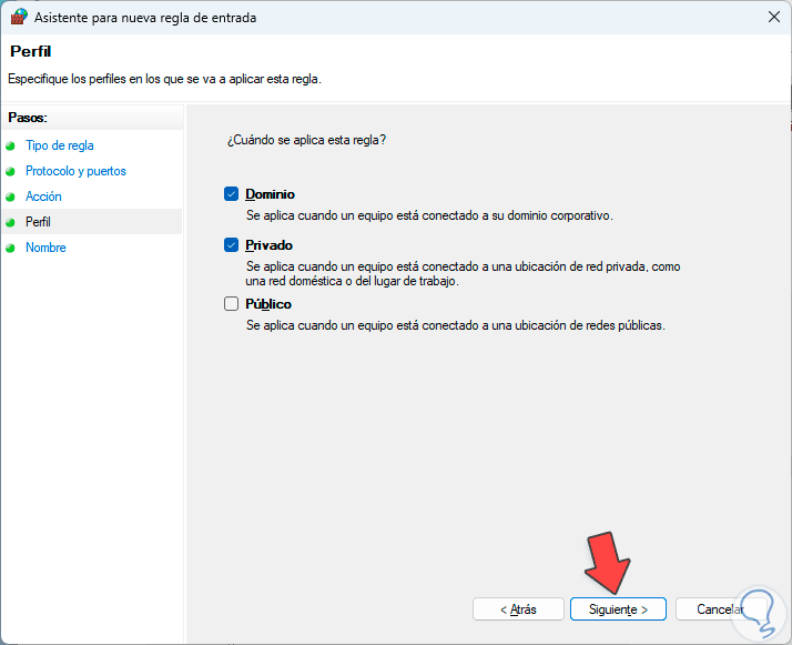 Luego determina dónde se aplicará la regla, es decir, en cuales tipos de red: