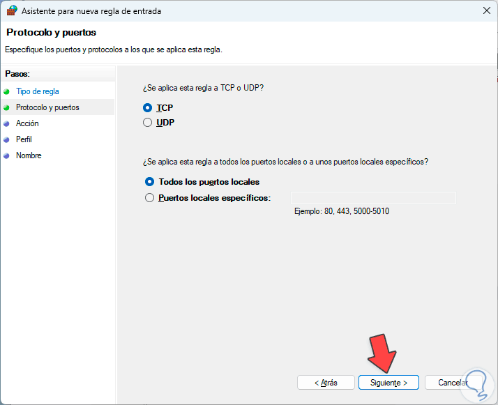 En la siguiente ventana define el tipo de protocolo (TCP o UDP) a usar y dónde se aplicará: