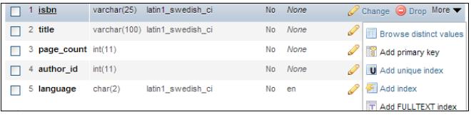 Una vez generado el nuevo campo o sobre un campo ya existente, podemos editar sus atributos desde la sección Structure, tenemos la posibilidad de agregar índices los cuales veremos en la próxima sección, transformar el campo en llave primaria (Primary key) o eliminar el campo de la tabla.