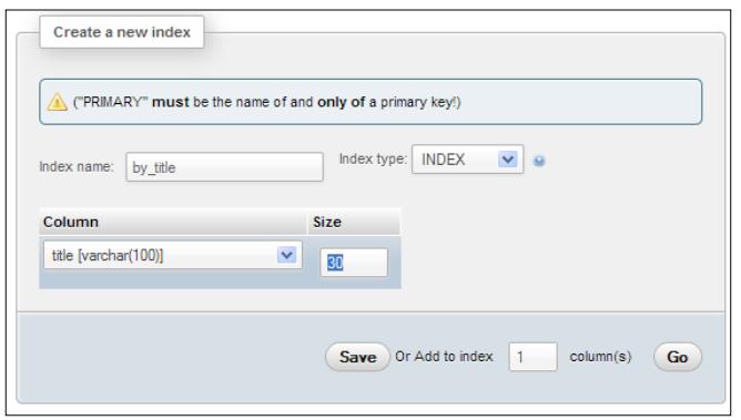 También cuando necesitamos tener un índice compuesto de más de un campo, podemos administrarlo y crearlo dentro de phpMyAdmin utilizando la opción Add to index 1 column(s) que se encuentra dentro del panel de creación de índices, al utilizarlo se nos creará un nuevo campo donde especificaremos la nueva columna a donde debe indexarse en conjunto con la ya creada.