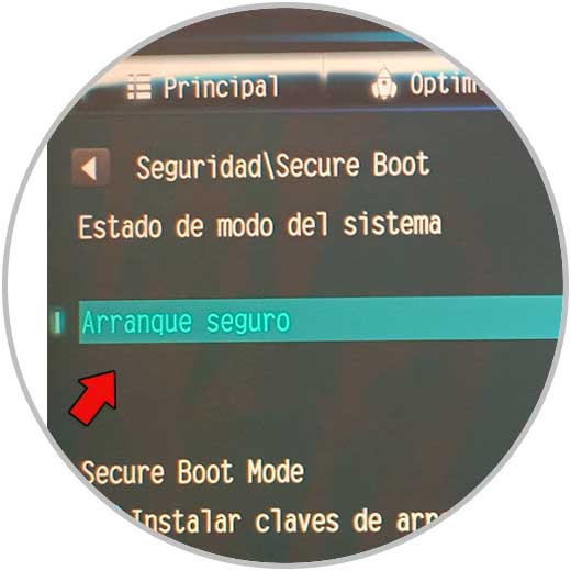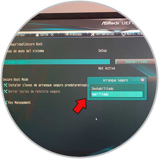 En "Secure Boot" en "Arranque seguro" asignamos el valor "Habilitado":