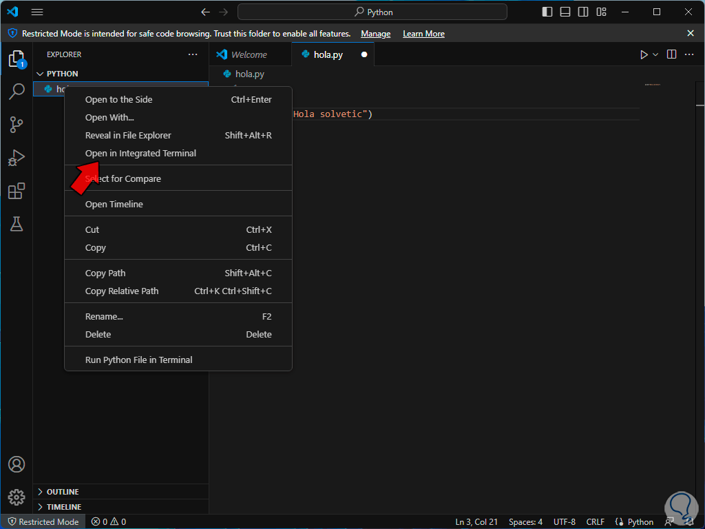 Damos clic derecho sobre el nombre del proyecto y seleccionamos la opción "Run Python File in Terminal":