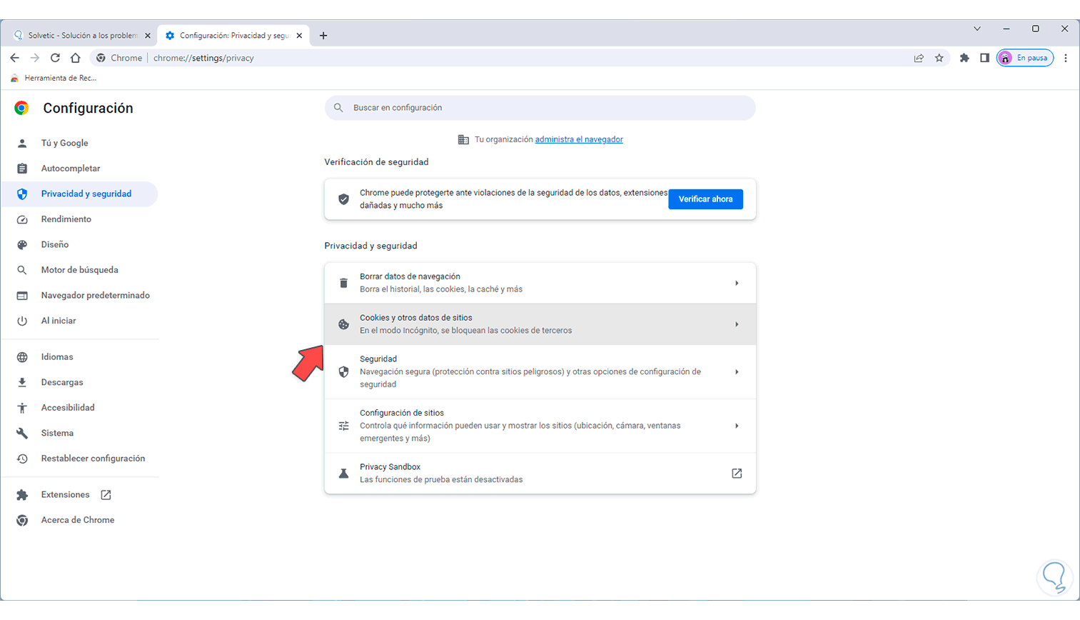 En la sección "Privacidad y seguridad" damos clic en "Cookies y datos de otros sitios":