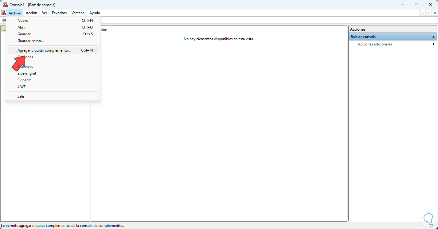 Tendremos acceso a la consola, allí damos clic sobre el menú Archivo y en el listado que se abre debes damos clic sobre la opción llamada Agregar o quitar complemento: