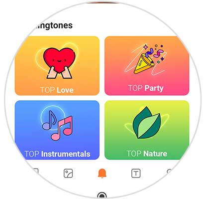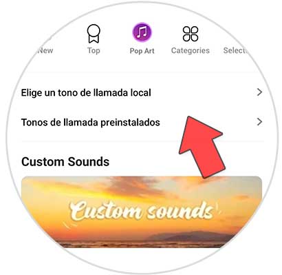 Como ya hemos activado la herramienta de “Temas”, si salimos y entramos de nuevo a la sección de “Tono de llamada” veremos que ahora la interfaz es diferente. Veremos que tenemos diferentes opciones para elegir un tono de llamada como “Custom sounds” o categorías de sonidos. Tienes sugerencias desde categoría de géneros musicales hasta tonos ordenados por función como puede ser la alarma o la notificación.
