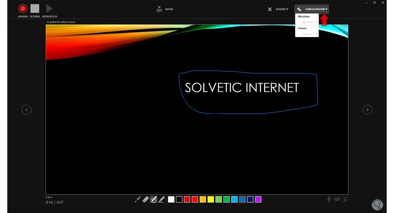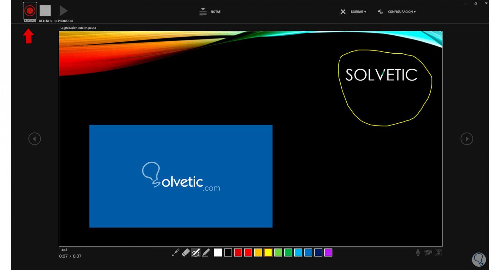 En la parte inferior disponemos de herramientas para editar o añadir elementos a la diapositiva, podemos seleccionar el deseado y elegir un color de la paleta disponible para luego usarlo en la diapositiva, antes de esto en la parte superior damos clic en el botón “GRABAR” para iniciar este proceso en PowerPoint y que todo lo que editemos quede registrado en el vídeo: