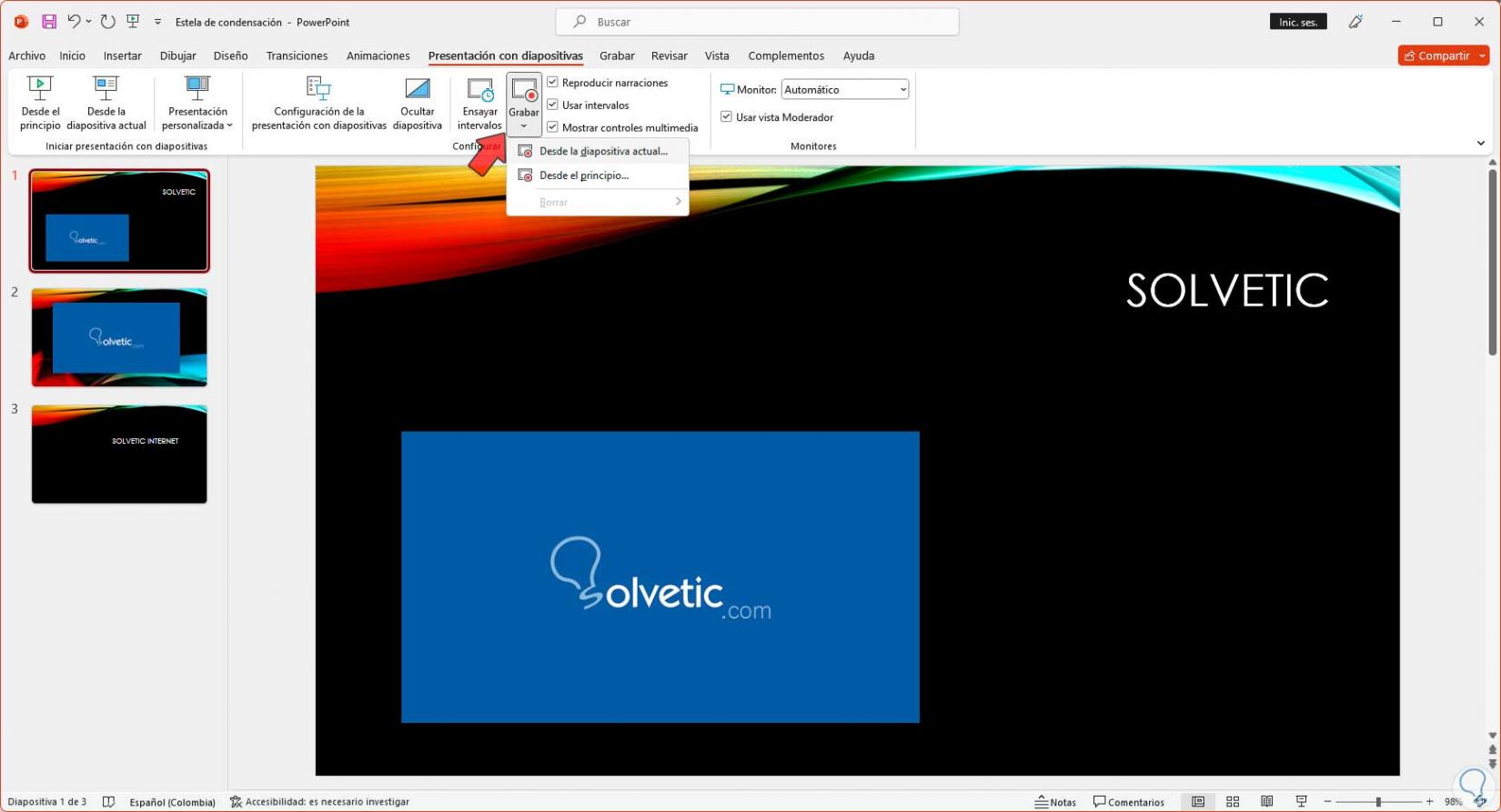 Ahora, para poder convertir nuestra presentación de PowerPoint a un vídeo, vamos a ir al menú “Presentación con diapositivas”, allí vamos a ver la opción “Grabar” ubicada en el grupo “Configurar”, al dar clic sobre ella podemos disponer de dos opciones.