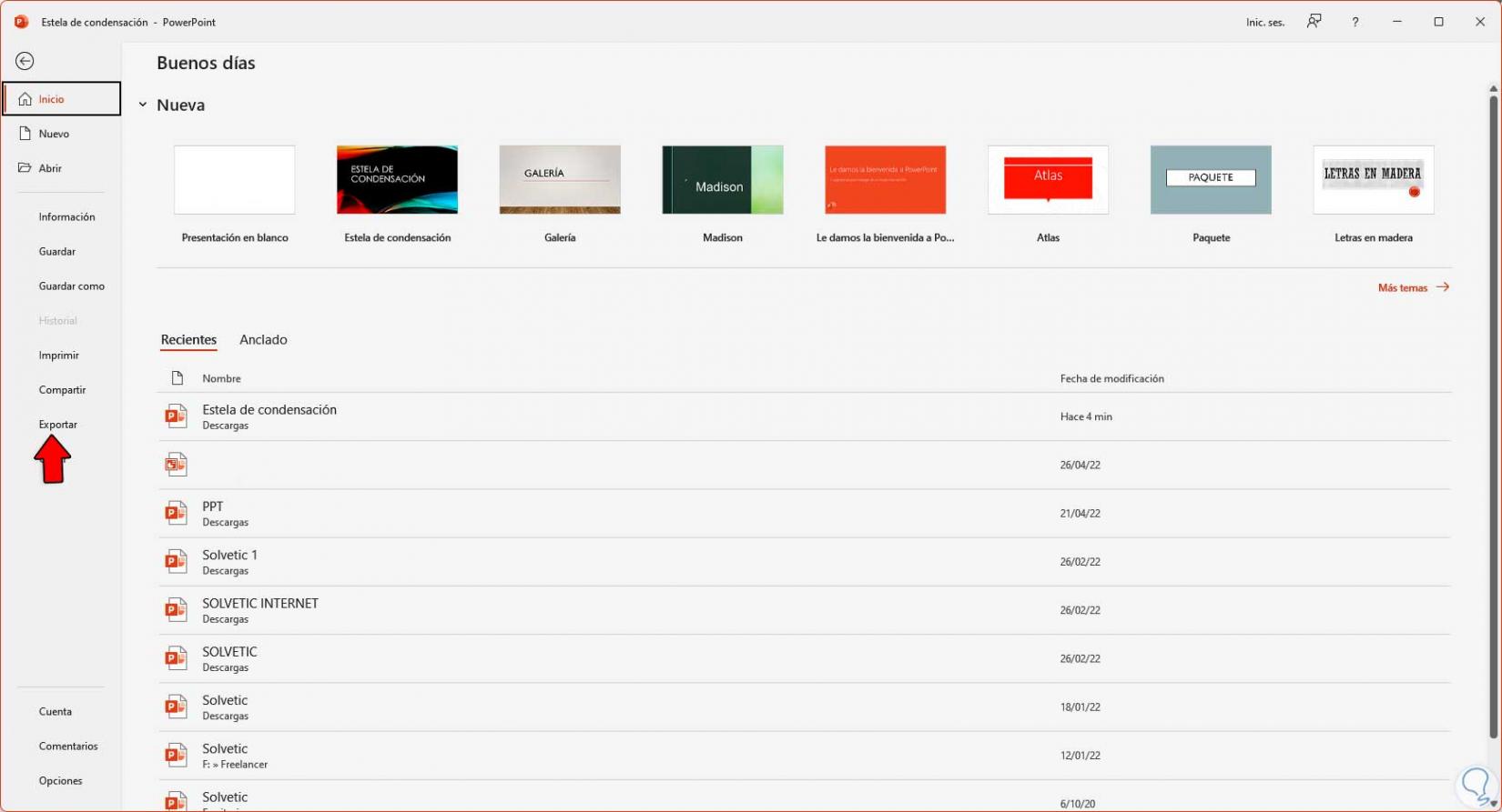 Los cambios que hicimos serán visibles en la presentación de PowerPoint. Ahora vamos a dar clic sobre el menú “Archivo” y allí damos clic en la opción “Exportar”: