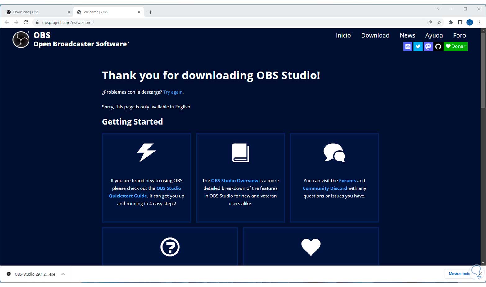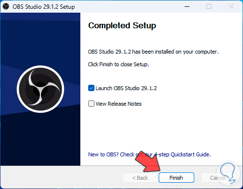 Damos clic en el botón Finish y de manera automática veremos que se abre OBS: