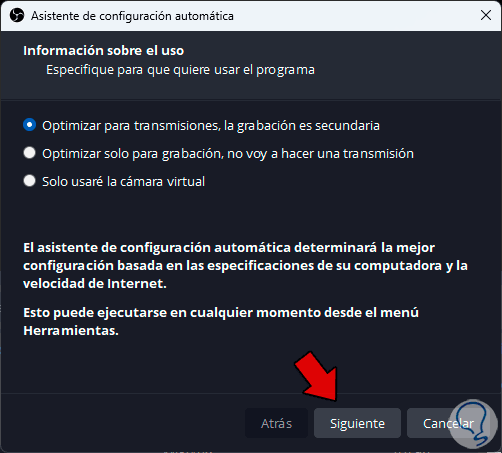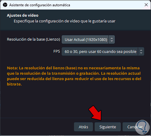 En la primer vez que se abre OBS será posible definir el uso que le daremos a OSB, en este caso activamos la casilla “Optimizar solo para grabación, no voy a hacer una transmisión” y damos clic en “Siguiente”, ahora definimos algunos ajustes de video: