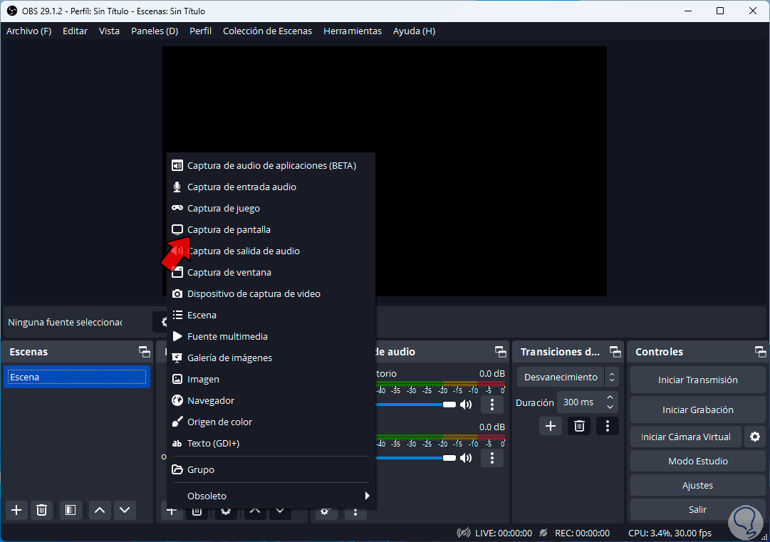 Una vez definido esto, en la sección llamada Fuentes damos clic sobre el signo + y en las opciones desplegadas damos clic en “Captura de pantalla”: