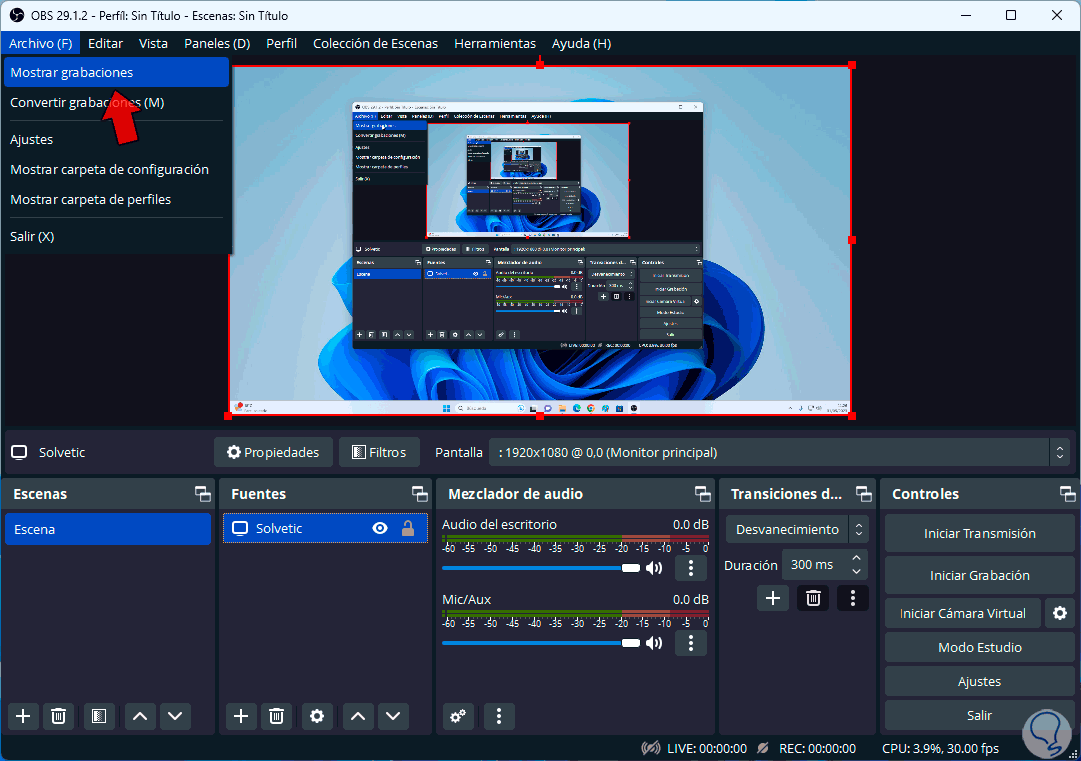 Para tener acceso a las grabaciones de OBS vamos a ir al menú “Archivo - Mostrar grabaciones”: