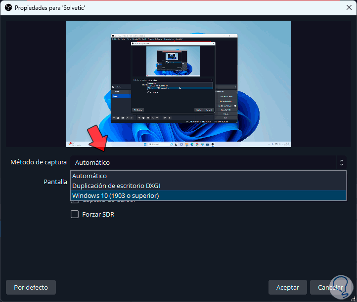 Allí vemos en tiempo real todo lo que hacemos en la pantalla y podremos definir los parámetros a usar en la grabación tanto de la pantalla como el método a usar: